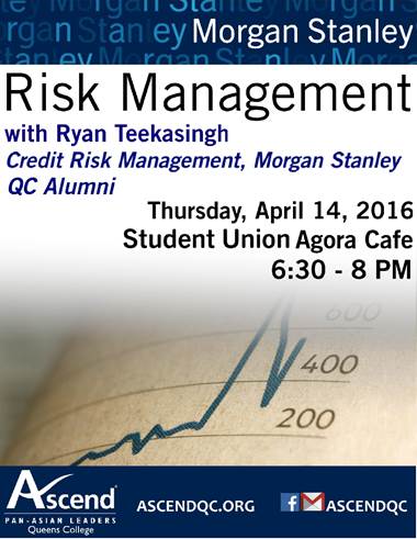 Ascend Event Annoucement: Morgan Stanley: Risk Management Thursday, April 14 6:30 - 8:00PM STUDENT UNION 1ST FLOOR - AGORA CAFÉ Ascend has invited a QC alum from Morgan Stanley to share with us about Risk Management. The speaker, Ryan Teekasingh, graduated from Queens College with a Risk Management master degree. He has 10 years of experience of over 4 different positions with Morgan Stanley and currently serves as the Counterparty Manager. He will be sharing his role plays a great part for trading, senior management and risk management to assess valuations and capital management of resources at Morgan Stanley. Please come to our event to learn more about the insight into Risk Management industry and the transition from a QC student to a professional at a multination financial service corporation. The event is open to all business students. Free food and drinks will be served.