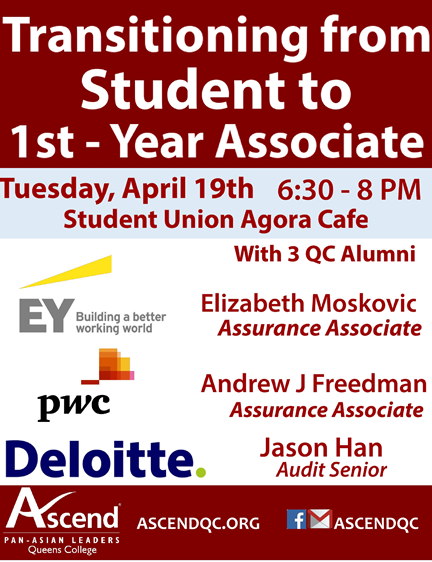 Ascend Event Annoucement: Deloitte, EY & PwC: Transitioning from Student to Associate Tuesday, April 19 6:30 - 8:00PM STUDENT UNION 1ST FLOOR - AGORA CAFÉ Our last infor session and the biggest event for the semester is on this coming Tuesday (tomorrow). We have invited three QC alumni,who are currently performaning audit practice at the Big 4 accounting firms. The three distinguished professionals are: Elizabeth Moskovic, Assurance Associate at EY , Andrew J Freedman,Assurance Associate at PwC, and Jason Han, Audit Senior at Deloitte. The speakers will share with us their Big 4 job landing process and their experience of working for a Big 4 firm. The event will cover topics such as interviews at Big 4 firms, the transition from a student to an associate, and busy season. This event is open to all business major students. Free food and drinks will be served.