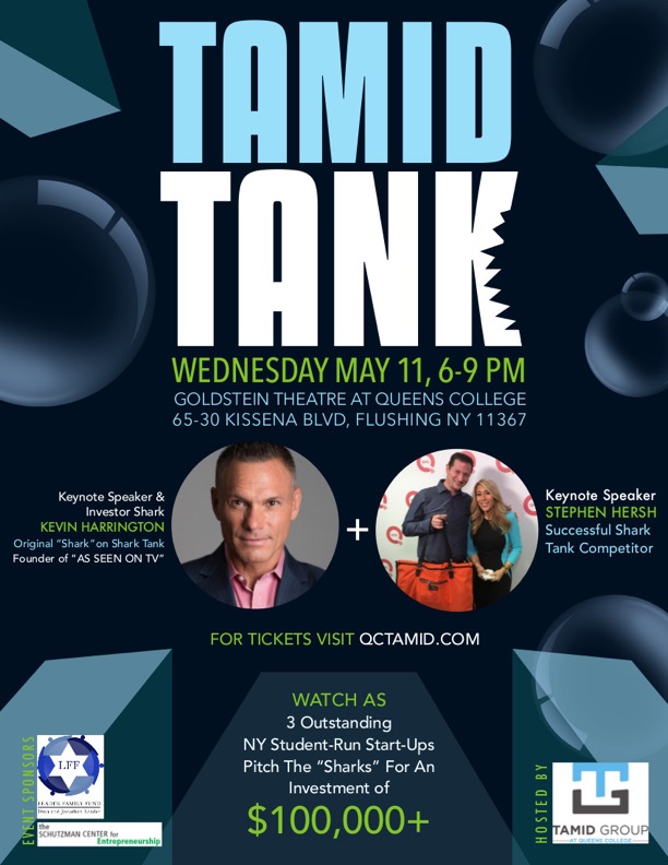 The Queens College chapter of TAMID is hosting a Shark Tank style event on campus on Wednesday, May 11th. All Queens College students are invited - this event will be an amazing opportunity to learn firsthand about entrepreneurship, investing, and innovation. Their event also features Kevin Harrington who was one of the original investors on the Shark Tank TV program. Three student start-ups from NYC will be pitching to the "sharks" for an investment of +$100,000. Don't miss out. Tickets are available at _kupferbergcenter.showare.com/eventperformances.asp?evt=204_ (http://kupferbergcenter.showare.com/eventperformances.asp?evt=204) Event: "TAMID Tank" Date: Wednesday, May 11, 2016 Time: Evening, 6:00-9:00pm Location: Goldstein Theatre (next to Colden) FB Event Page: _facebook.com/events/1147685731949727/_ (http://facebook.com/events/1147685731949727/) View flyer below and attached. -- Muaz Paracha Chair of Career Development Queens College - Student Association "Students serving Students"