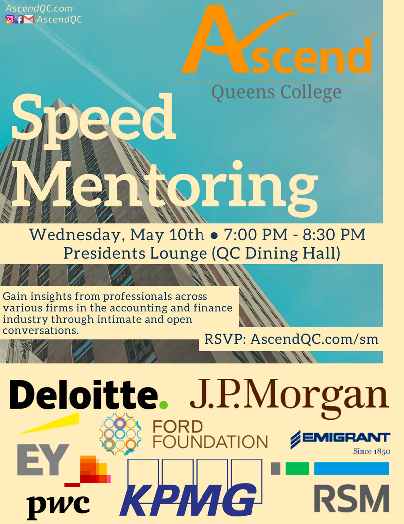 Speed Mentoring Ascend QC is hosting its inaugural Speed Mentoring event to help you land a job/internship! Just think speed dating, but with mentors instead. You will have the opportunity to break out into various small groups and initiate open and intimate discussions with several professionals. Speak to those who stood in your shoes not too long ago, learn what helped make them successful, and use this newfound knowledge to capitalize on all your future opportunities! _RSVP Today: AscendQC.com/sm_ (http://ascendqc.us11.list-manage.com/track/click?u=dc72458847abecb3cc2d1f7fb...) Time and Location: Wednesday, May 10th 7:00 PM - 8:30 PM Presidents Lounge