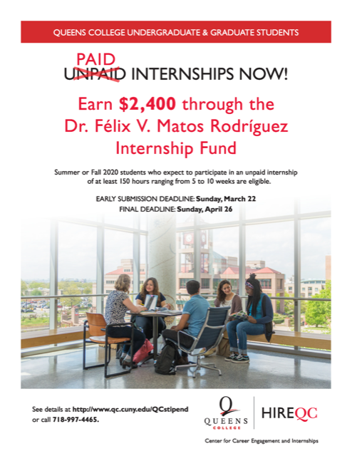 Professor Marvin F. Milich Director, Accounting Graduate Program Deputy Chair, Advisement Begin forwarded message: From: Zavi Gunn <Zavi.Gunn@qc.cuny.edu> Date: April 13, 2020 at 1:51:36 PM EDT To: Alicia Alvero <Alicia.Alvero@qc.cuny.edu>, Allison Charny <Allison.Charny@qc.cuny.edu>, Norka Blackman-Richards <Norka.BlackmanRichards@qc.cuny.edu>, Darija S Stosic <Darija.Stosic@qc.cuny.edu>, Jane Cho <Jane.Cho@qc.cuny.edu>, "chassvan@earthlink.net" <chassvan@earthlink.net>, Julian Cornell <Julian.Cornell@qc.cuny.edu>, Joshua S Barnes <Joshua.Barnes@qc.cuny.edu>, Karen Weingarten <Karen.Weingarten@qc.cuny.edu>, Kenneth J Lord <Kenneth.Lord@qc.cuny.edu>, Lev Deych <Lev.Deych@qc.cuny.edu>, Norka Blackman-Richards <Norka.BlackmanRichards@qc.cuny.edu>, Schiro Withanachchi <Schiro.Withanachchi@qc.cuny.edu>, "suzannesophiastrickland@gmail.com" <suzannesophiastrickland@gmail.com>, Alan Sultan <Alan.Sultan@qc.cuny.edu>, Tarry Hum <Tarry.Hum@qc.cuny.edu>, Mariana Zinni <Mariana.Zinni@qc.cuny.edu>, Ashima K Kant <Ashima.Kant@qc.cuny.edu>, Gary T Haehlen <Gary.Haehlen@qc.cuny.edu>, Taruna D Sadhoo <Taruna.Sadhoo@qc.cuny.edu>, Ryan H Smith <Ryan.Smith@qc.cuny.edu>, Jason Tougaw <Jason.Tougaw@qc.cuny.edu>, Mohammad Ashraf <Mohammad.Ashraf@qc.cuny.edu>, Danielle B Izzo <Danielle.Izzo@qc.cuny.edu>, Ying Zhou <Ying.Zhou@qc.cuny.edu>, Joan Nix <joan.nix@qc.cuny.edu>, Marvin F Milich <Marvin.Milich@qc.cuny.edu>, Marco F Navarro <Marco.Navarro@qc.cuny.edu>, Lisa Dangelo <Lisa.Dangelo@qc.cuny.edu>, Denise Miller <denise.miller@qc.cuny.edu> Cc: Elizabeth Oconnell <liz.oconnell@qc.cuny.edu>, Diane Shults <Diane.Shults@qc.cuny.edu>, Lisa Louis-Marijanski <Lisa.Louis.Marijanski@qc.cuny.edu> Subject: $2,400 Stipend for Unpaid Internship during Summer or Fall 2020 Dear Colleagues, I hope all is well with you and family. Did you know that your students can still apply for $2,400 stipend towards an unpaid internship, of their choice, including remote work? The Dr. Félix V. Matos Rodríguez Internship Fund application deadline is Sunday, April 26th, share information with students and encourage them to apply today http://www.qc.cuny.edu/qcstipend! Letter of recommendation can be submitted separately from the student application. Here is a quick video tutorial on how to apply: https://www.youtube.com/watch?v=THUleL03AM0&t=15s [cid:d6b58092-84c2-494e-913c-1a2fc1828aa7] Regards, Zavi Zavi Gunn Director Center for Career Engagement and Internships Queens College, CUNY Visit our Career Website<http://www.qc.cuny.edu/career> Employer and Student HireQC Log-In<http://www.qc.cuny.edu/hireqc> Students can schedule a virtual appointment<http://tinyurl.com/qccareercontact> <http://www.qc.cuny.edu/qcstipend> Apply for summer or fall $2,400 internship stipend<http://qc.cuny.edu/qcstipend>