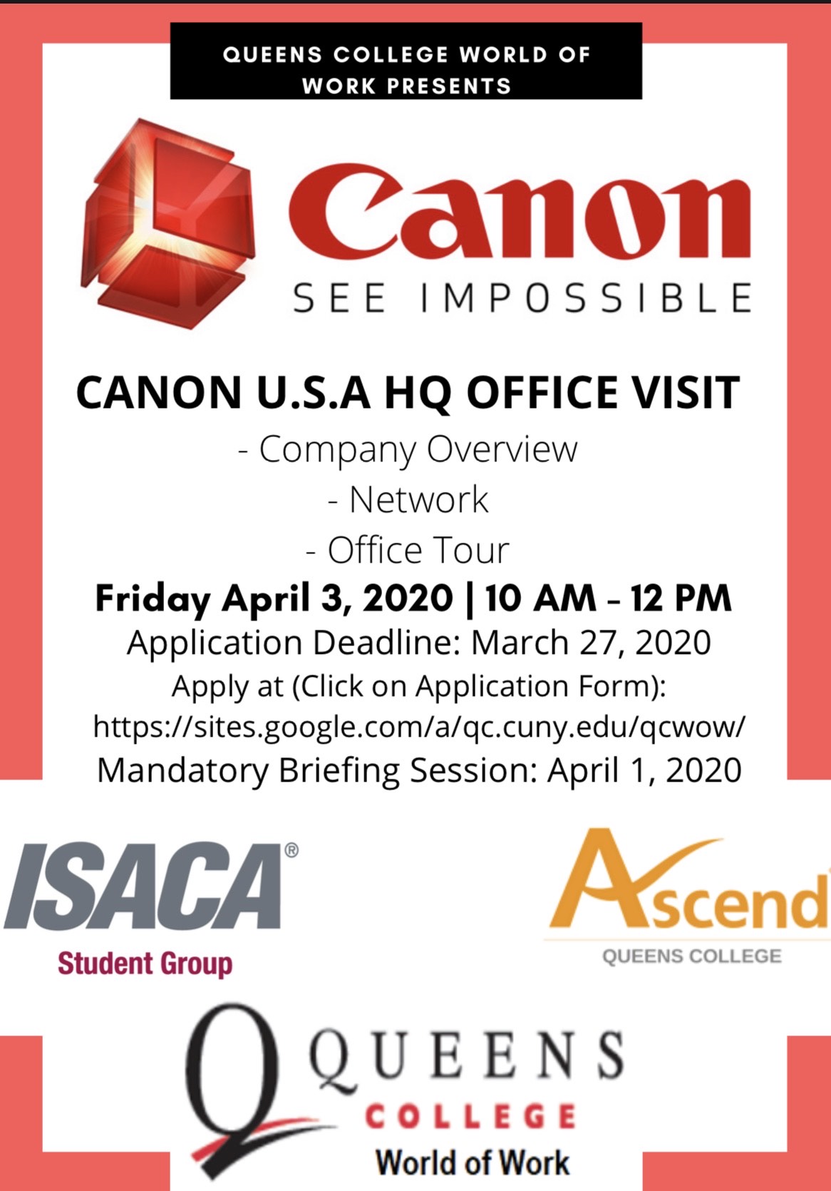Professor Marvin F. Milich Director, Accounting Graduate Program Deputy Chair, Advisement Begin forwarded message: From: Richard Balram <Richard.Balram47@qmail.cuny.edu> Date: January 30, 2020 at 9:48:09 AM EST To: Marvin F Milich <Marvin.Milich@qc.cuny.edu> Subject: Canon U.S.A HQ Office Visit - 04/03/2020 Please Share!! Queens College Accounting Students, The ISACA Student Group, Ascend, and World of Work Presents: Canon U.S.A HQ Office Visit: (Company Overview, Network, Q&A, and Showroom Tour) * Friday April 3, 2020 * Time: 10 AM - 12 PM * Apply at: https://sites.google.com/a/qc.cuny.edu/qcwow/ (Click on Application Form) * Application Deadline: Friday March 27, 2020 * Mandatory Briefing Session: Wednesday April 1, 2020 * Open to all Accounting/Business Students Below is the flyer for more information!