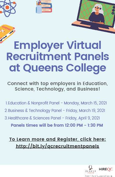 ________________________________ From: David Engel <David.Engel@qc.cuny.edu> Sent: Tuesday, March 9, 2021 10:16 AM Subject: Employer Virtual Recruitment Panels and Career Workshops Hello Faculty, Staff and Student Clubs – I hope you are doing well. Next week and in April we will be having Employer Virtual Recruitment Panels, where students will be able to learn about career opportunities and tips from 3-5 employers. See below for agenda. If you know of students who are look for job opportunities, please share the attached flyers with them. To help students prepare for the panels, we have some career development workshops today at 5pm and Friday at 12:30pm. There are also other workshops in HireQC (www.qc.cuny.edu/HireQC<http://www.qc.cuny.edu/HireQC>). See attached for flyers. We hope you can make it! Panels Agenda * 12-12:45PM: Company information panel facilitated by career staff, where four to five employers share information about their company with students * 12:45-1:30PM: Employer breakout session to educate students on professional development, such as interview preparation * 1:1 Meetings with Select-Group of Students: After the event, students will receive a follow up to schedule 1:1 meetings via employer calendar links Register Here: http://bit.ly/qcrecruitmentpanels [cid:image013.jpg@01D714CD.1A4464A0]<http://bit.ly/qcrecruitmentpanels> Best, David David Engel (pronouns<https://www.youtube.com/watch?v=3xpvricekxU>: he, him, his) Alumni & Employer Engagement Specialist Queens College, Center for Career Engagement and Internships 65-30 Kissena Blvd, Frese Hall Room 213, Flushing, NY 11367 david.engel@qc.cuny.edu<mailto:david.engel@qc.cuny.edu> www.qc.cuny.edu/career<http://www.qc.cuny.edu/career> Book a Career Coaching Appointment: https://navigate.qc.cuny.edu/ Please provide Career Services Feedback: https://bit.ly/careerfeedback2020 QC Students and Alumni: Share with us where you are working<https://queenscollege-csm.symplicity.com/surveys/qcquicksurvey> HireQC Jobs and Events<http://www.qc.cuny.edu/hireqc> | Employers Post Jobs Here<http://www.qc.cuny.edu/hireqc> | Vault Career Research<http://access.vault.com/career-insider-login.aspx?aid=148719> Follow Us on Social Media [https://s3.us-east-1.amazonaws.com/symp-images/csm/queenscollege/tinyfiles/Facebook_Logo__2019_.png]<https://www.facebook.com/QCCareerCenter/> [https://s3.us-east-1.amazonaws.com/symp-images/csm/queenscollege/tinyfiles/I...] <https://www.instagram.com/qc_career/> [https://s3.us-east-1.amazonaws.com/symp-images/csm/queenscollege/tinyfiles/L...] <https://www.linkedin.com/in/queens-college-center-for-career-engagement-and-internships-9b72b9182/> [https://s3.us-east-1.amazonaws.com/symp-images/csm/queenscollege/tinyfiles/Y...] <https://www.youtube.com/channel/UCc0C7vYbs8PbQL947Pdz9PQ/featured> [Critical Need Fund Page QCF logo icon]<https://give.classy.org/qccareercenter> Join the team today! Support Queens College Critical Needs Funds<https://give.classy.org/qccareercenter>