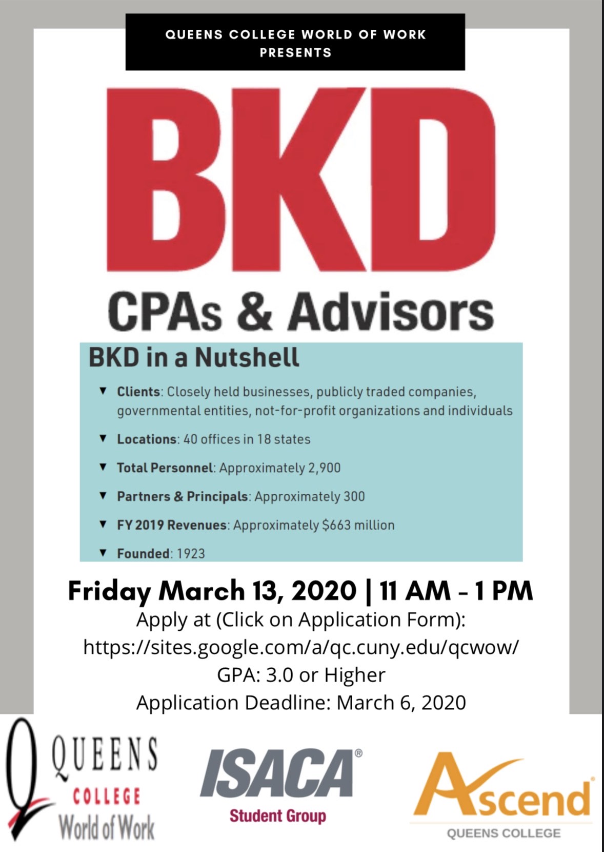 Professor Marvin F. Milich Director, Accounting Graduate Program Deputy Chair, Advisement Begin forwarded message: From: Richard Balram <Richard.Balram47@qmail.cuny.edu> Date: January 30, 2020 at 9:43:04 AM EST To: "professormilich@aol.com" <professormilich@aol.com>, Marvin F Milich <Marvin.Milich@qc.cuny.edu> Subject: BKD Office Visit - 03/13/2020 Please Share!! Queens College Accounting Students, The ISACA Student Group, Ascend, and World of Work Presents: BKD Office Visit: (Information, Networking, Q&A) * Friday, March 13, 2020 * Time: 11 AM - 1 PM * GPA: 3.0 or Higher * Apply at: https://sites.google.com/a/qc.cuny.edu/qcwow/ (Click on Application Form) * Application Deadline: Friday March 6, 2020 * Mandatory Briefing Session: Wednesday March 11, 2020 * Open to all Accounting Students Below is the flyer for more information!
