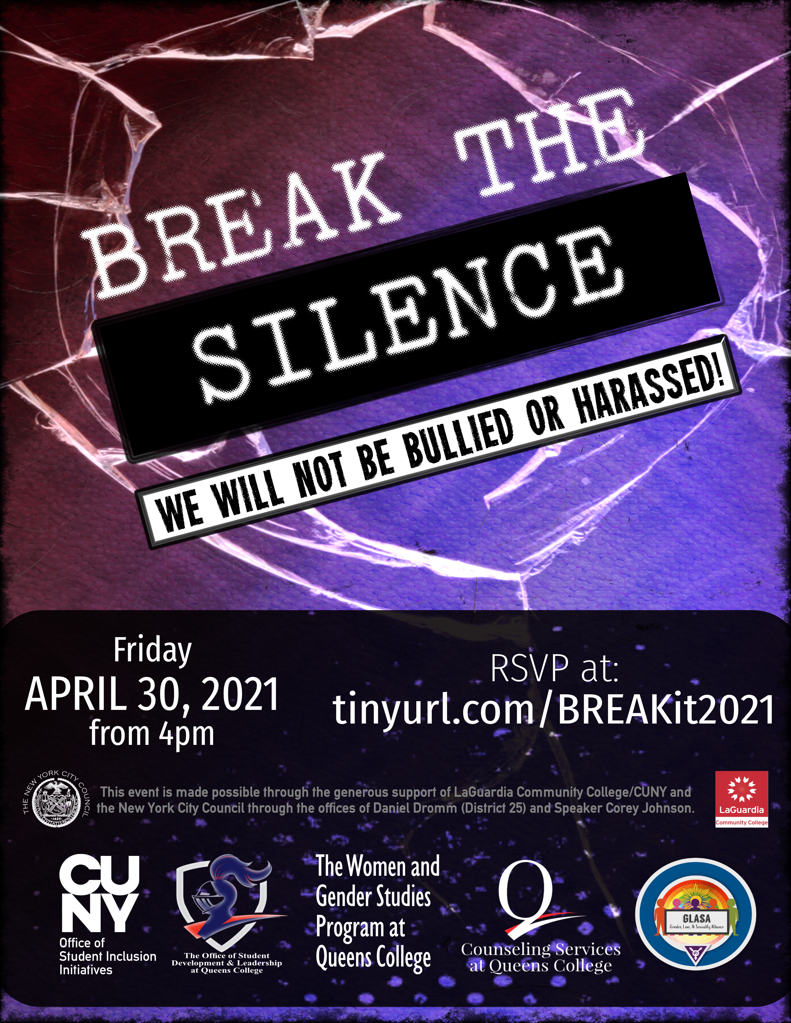 Break the Silence: We Will Not Be Bullied and Harassed! Friday, April 30th, 4pm - 5pm Please join us for an empowering event celebrating the strength and resilience of our LGBTQI+ students. Break the Silence: We Will Not Be Bullied and Harassed will be held this year on Friday, April 30th at 4PM. Please Register by April 29th: https://tinyurl.com/BREAKit2021 National Day of Silence was created by GLSEN in 1996. This event sheds light on what many LGBTQI+ youth experience daily. Initially intended to focus on this problem within workplaces, this campaign subsequently expanded into university campuses, school systems, and sporting events. Yearly, millions participate by staying silent for the duration of their day, representing the silencing of LGBTQI+ students. Many participants choose to wear tape over their mouths or Xs on their hands to further call attention to the movement. Please observe this tradition, if you are able, on National Day of Silence, which will be held this year on April 23rd. At 4 pm on Friday, April 30th, we will officially break our silence, tell stories, share feelings, and explore ways in which we can more effectively take control of our lives and identities. Poetry, song, art and all forms of creative expression are welcome at the open sharing portion of the program. A short film will be screened with commentary by the Trevor Project. This event will be recorded and archived at the CUNY LaGuardia and Wagner Archives. This event is made possible through the generous support of LaGuardia Community College/CUNY and the New York City Council through the offices of Daniel Dromm (District 25) and Speaker Corey Johnson. Co-sponsors: The Queens College Office of Student Development and Leadership, the CUNY Office of Student Inclusion Initiatives, the Women and Gender Studies Program at Queens College, the Queens College Counseling Services Center, and the Gender, Love and Sexuality Alliance/GLASA, at Queens College. We hope to see you there! Register here: https://tinyurl.com/BREAKit2021 -JC JC Carlson (They/Them/Theirs: What does this mean?<https://deconforming.com/they-them-pronouns/>) Student Life Events Manager LGBTQIAA+ Programs Coordinator Associate Coordinator, CUNY Queens LGBTQI+ Consortium Queens College CUNY Office of Student Development & Leadership Student Union Room LL23 65-30 Kissena Blvd Flushing, NY 11367 718-997-3952/917-659-2646