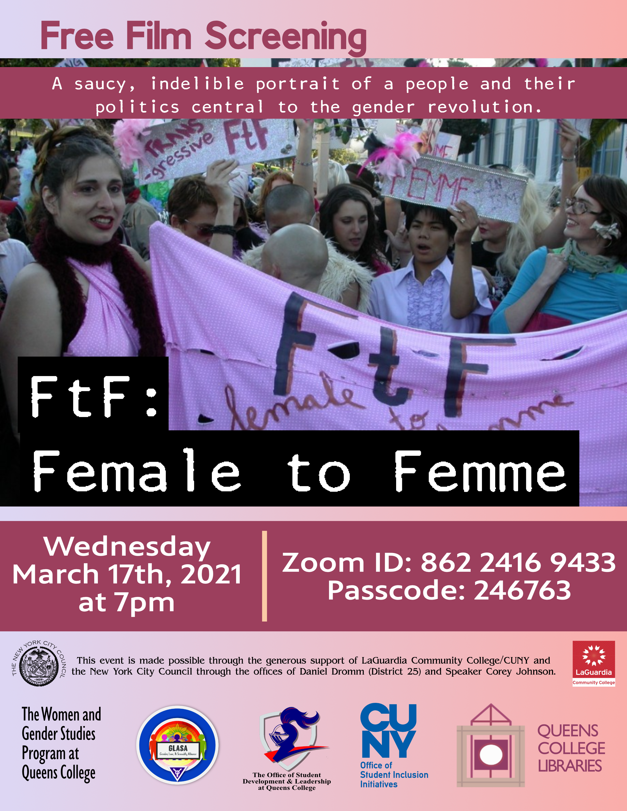 Good Morning, Student Leaders. Please join us for a free film screening on Wednesday, March 10th at 7pm. Join Zoom Meeting https://us02web.zoom.us/j/86224169433?pwd=bUZoV2R3UmorNmxUREdYTnNTd3BUQT09 Meeting ID: 862 2416 9433 Passcode: 246763 [cid:83708913-a765-4401-ba87-c81c43255373] This film screening is made possible through the generous support of LaGuardia Community College/CUNY and the New York City Council through the offices of Daniel Dromm (District 25) and Speaker Corey Johnson. Co-sponsors: The Queens College Office of Student Development and the Queens College Libraries. -JC JC Carlson (They/Them/Theirs: What does this mean?<https://deconforming.com/they-them-pronouns/>) Student Life Events Manager LGBTQIAA+ Programs Coordinator Associate Coordinator, CUNY Queens LGBTQI+ Consortium Queens College CUNY Office of Student Development & Leadership Student Union Room LL23 65-30 Kissena Blvd Flushing, NY 11367 718-997-3952/917-659-2646