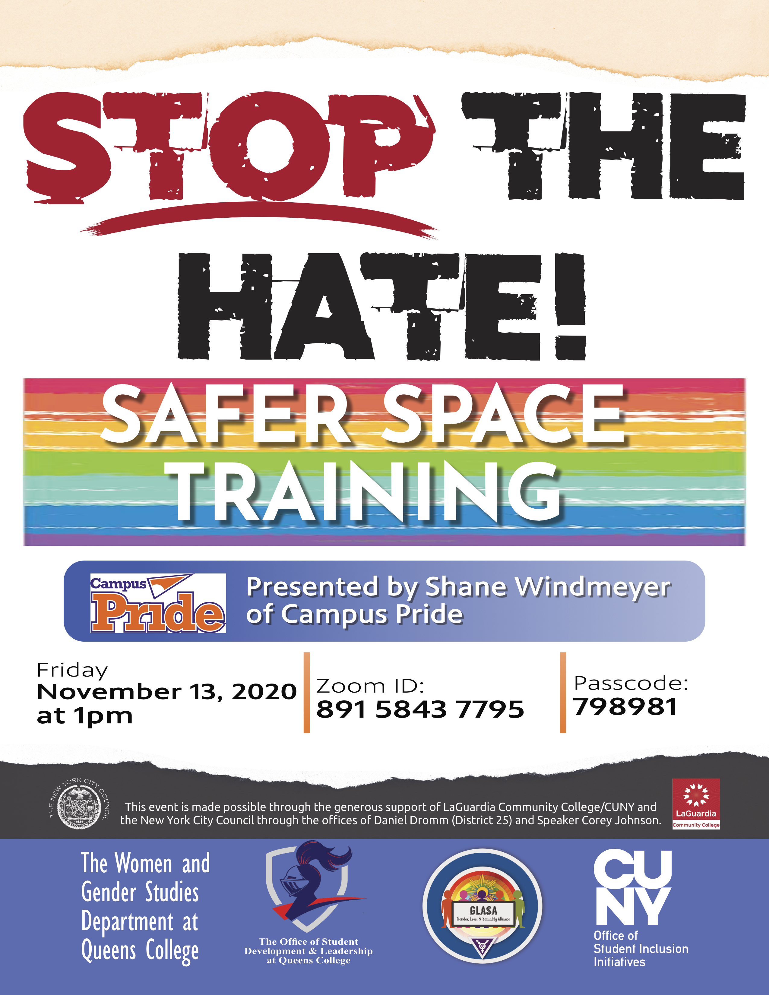 Good Morning, Student Leaders! Tomorrow is the big day. Please join us for Stop the Hate: Safer Space Training on Friday, November 13, 2020, from 1pm to 3pm?. This program, led by Shane Windmeyer of Campus Pride, is designed to teach CUNY student leaders, faculty and staff how to create more inclusive campus and virtual spaces for LGBTQI+ folx. Upon completion of this class, CUNY student leaders, faculty and staff will be equipped to train their peers to do the same. Certificates of Completion will be sent to participants. Pre-registration is not required. Join Zoom Meeting https://us02web.zoom.us/j/89158437795?pwd=Wm9kWWNIY3JKZEFUNnhyQW5vVVdxZz09 Meeting ID: 891 5843 7795 Passcode: 798981? The event is brought to you by the Queens College Office of Student Development and Leadership in partnership with LaGuardia Community College and the New York City Council through the offices of Daniel Dromm (District 25) and Speaker Corey Johnson. Co-sponsors: Queens College Gender, Love and Sexuality Alliance/GLASA, the Queens College Office of Student Development and Leadership, the Women and Gender Studies Department at Queens College, and the CUNY Office of Student Inclusion Initiatives.? Please share with your club members. [cid:16290f8c-4b9b-4b73-8b4e-ce492cd36ae5] Seeya there! -JC? JC Carlson (They/Them/Theirs: What does this mean?<https://deconforming.com/they-them-pronouns/>) Student Life Events Manager LGBTQIAA+ Programs Coordinator Associate Coordinator, CUNY Queens LGBTQI+ Consortium Queens College CUNY Office of Student Development & Leadership Student Union Room LL23 65-30 Kissena Blvd Flushing, NY 11367 718-997-3952/917-659-2646
