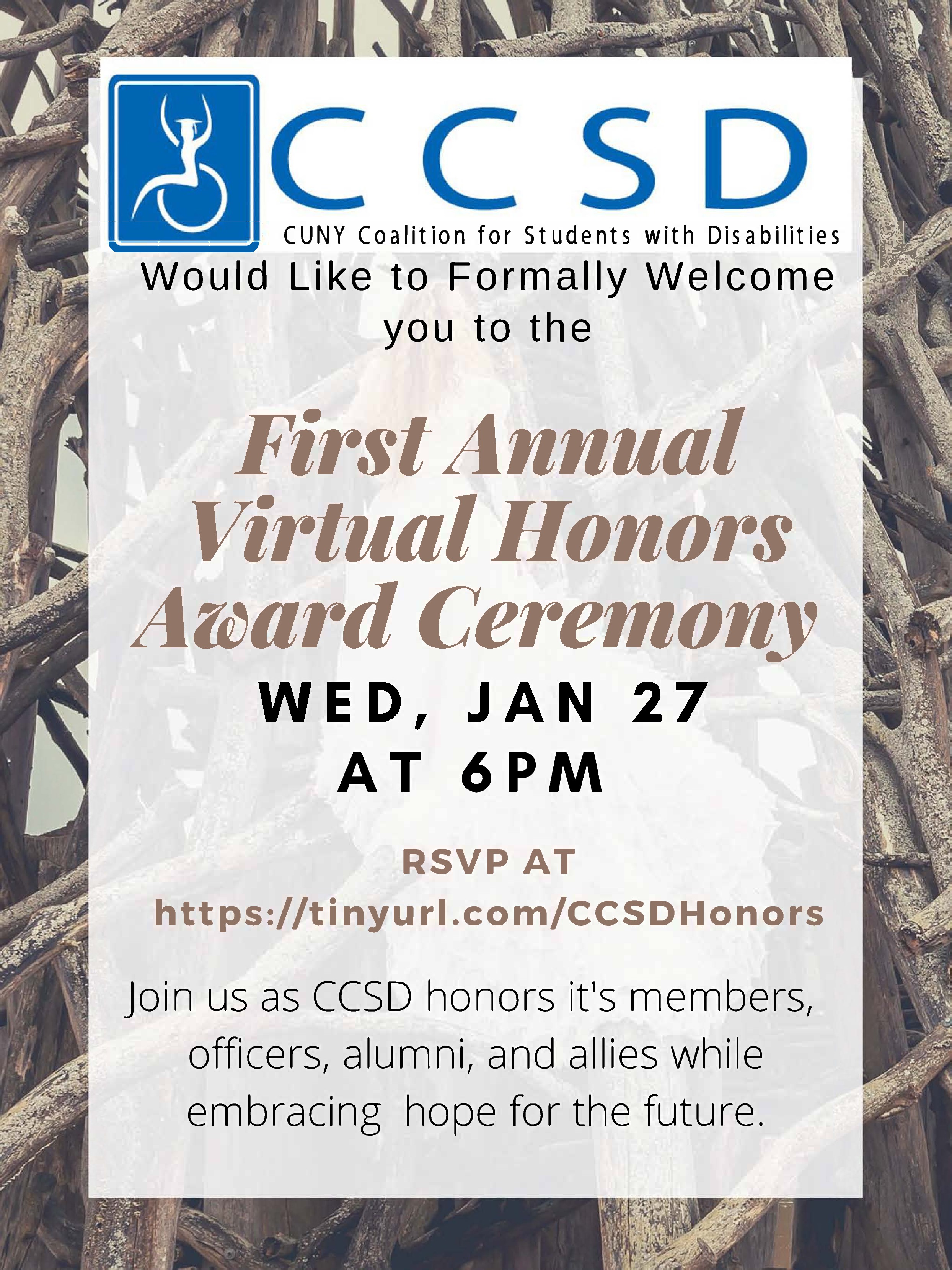 Good Morning, Queens College Student Leaders. As a reminder, the CUNY Coalition for Students with Disabilities? cordially invites you to attend their First Annual CCSD Honors Award Ceremony ?tonight, Wednesday, January 27, 2021 at 6PM. Please RSVP: https://tinyurl.com/CCSDHonors [cid:2fdadc1d-2323-4655-81e4-ead9046e45a9]? Please share with your members, friends and colleagues. Seeya there. Thanks. -JC JC Carlson (They/Them/Theirs: What does this mean?<https://deconforming.com/they-them-pronouns/>) Student Life Events Manager LGBTQIAA+ Programs Coordinator Associate Coordinator, CUNY Queens LGBTQI+ Consortium Queens College CUNY Office of Student Development & Leadership Student Union Room LL23 65-30 Kissena Blvd Flushing, NY 11367 718-997-3952/917-659-2646