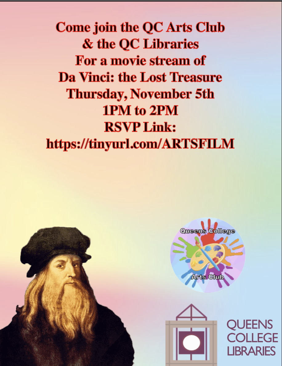 Good Morning, Student Leaders. Please join the QC Art Club for a FREE Screening of DaVinci: The Lost Treasure. Please register at: https://forms.gle/G7Pt42icN68ZYbdT9 This event s co-sponsored by The Libraries at Queens College. [cid:25d62321-e9bd-46f4-bf97-36df168632c6]? JC Carlson (They/Them/Theirs: What does this mean?<https://deconforming.com/they-them-pronouns/>) Student Life Events Manager LGBTQIAA+ Programs Coordinator Associate Coordinator, CUNY Queens LGBTQI+ Consortium Queens College CUNY Office of Student Development & Leadership Student Union Room LL23 65-30 Kissena Blvd Flushing, NY 11367 718-997-3952/917-659-2646