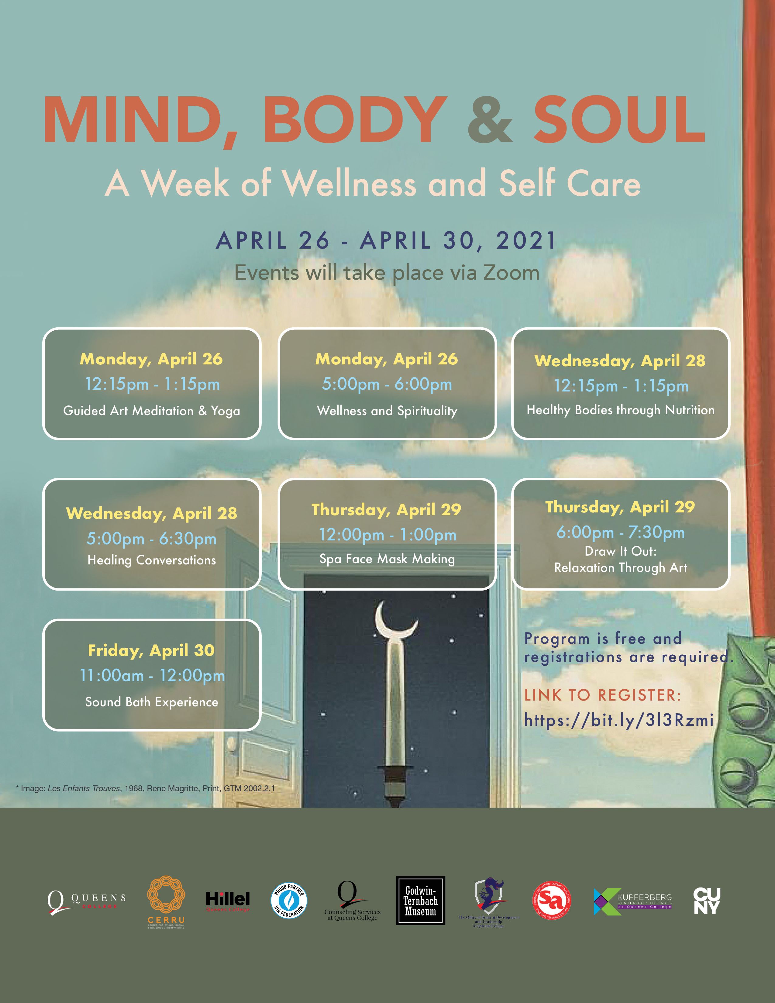 Good Afternoon, Student Leaders. Mind, Body and Soul is a week of wellness and self-care designed to assist Queens College students as they move into the final weeks of the spring semester. These programs are FREE and registration is required. LINK TO REGISTER: https://bit.ly/3l3Rzmi [cid:0e41f489-c7a7-4581-b7d0-901ad02d88b1] Activity and workshop descriptions: Monday, 4/26, at 12:15pm Guided Art Meditation & Yoga Description: Indulge in mid-day relaxation through a guided art meditation and yoga practice. Monday, 4/26, at 5pm Wellness & Spirituality Description: What does Spirituality have to do with wellness: a discussion regarding various religious practices and wellness. Wednesday, 4/28, at 12:15pm Healthy Bodies through Nutrition Description: Learn how to take care of your body through physical activity and healthy eating. Recipes and physical exercises will be offered as part of the discussion. Wednesday, 4/28, at 5pm Healing Conversations Description: Take a break and have a conversation with your peers about the things stressing you out and learn ways to de-stress mentally during finals. Thursday, 4/29, at 12pm Spa Face Mask Making Description: We will demonstrate how to make three different masks using household items: The Organic Banana Mask, The Breakfast Mask, and The Honey Citrus Mask. Thursday, 4/29, at 6pm Draw It Out: Relaxation through Art Description: Jan Arzooman will share with you some techniques to calm your mind. You bring the paper, pencil and a fine point marker OR a smooth flowing pen of any kind and Jan will show you how to let go of the stress. No previous experience necessary. Friday, 4/30, at 11am Sound Bath Experience Description: Let Greg Prasker from Wolfpack Ascension and Spiritual Badasses take you on a sound healing journey as he channels divine energy to help you remove obstacles and manifest spiritual wellness. Please share far and wide. Thanks. -JC JC Carlson (They/Them/Theirs: What does this mean?<https://deconforming.com/they-them-pronouns/>) Student Life Events Manager LGBTQIAA+ Programs Coordinator Associate Coordinator, CUNY Queens LGBTQI+ Consortium Queens College CUNY Office of Student Development & Leadership Student Union Room LL23 65-30 Kissena Blvd Flushing, NY 11367 718-997-3952/917-659-2646