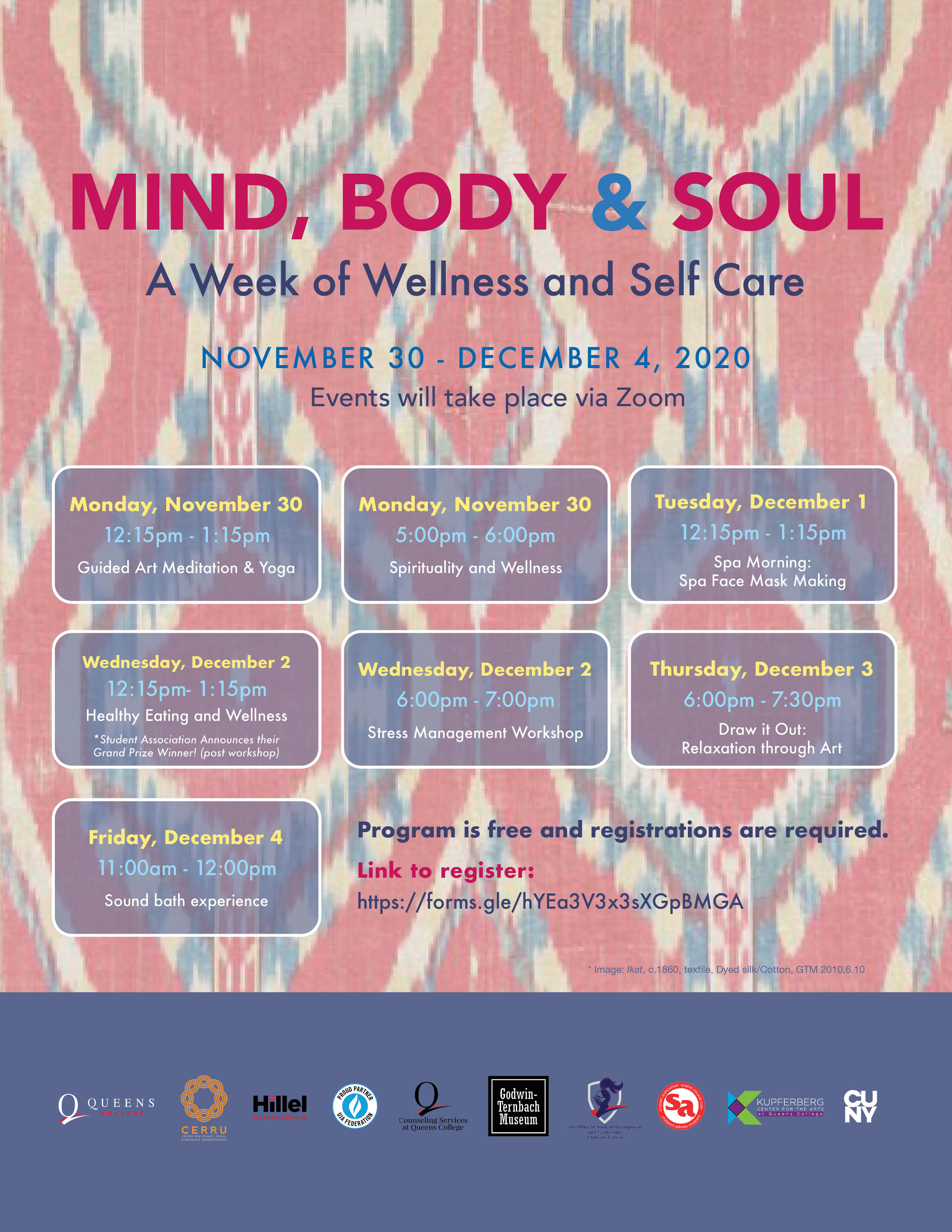 Good Afternoon, Student Leaders. Mind, Body and Soul is a week of wellness and self-care designed to assist Queens College students as they move into the final weeks of the fall semester. These programs are free and registrations are required. Link to register: https://forms.gle/hYEa3V3x3sXGpBMGA Activity and workshop descriptions: Monday, 11/30, at 12:15pm Guided Art Meditation & Yoga Description: Indulge in mid-day relaxation through a guided art meditation and yoga practice. Monday, 11/30, at 5pm Spirituality & Wellness Description: What does Spirituality have to do with wellness: a discussion regarding various religious practices and wellness. Tuesday, 12/1, at 12:15pm Spa Morning: Spa Face Mask Making Description: We will demonstrate how to make three different masks using household items: The Organic Banana Mask, The Breakfast Mask, and The Honey Citrus Mask. Wednesday, 12/2, at 12:15pm Healthy Eating Description: Learn how to take care of your body through physical activity and healthy eating. Recipes and physical exercises will be offered as part of the discussion. and Student Association Announces Their Grand Prize Winner! Description: It's time to announce the winner of the QC Miles 4 Week Challenge. The grand prize is an Apple watch and a second prize for the runner-up will also be revealed. Find out if you've won, and how to enter the next challenge! Wednesday, 12/2, at 6pm Stress Management Workshop Description: Take a break and have a conversation with your peers about the things stressing you out and learn ways to de-stress mentally during finals. Thursday, 12/3, at 6pm Draw It Out: Relaxation through Art Description: Jan Arzooman will share with you some techniques to calm your mind. You bring the paper, pencil and a fine point marker OR a smooth flowing pen of any kind and Jan will show you how to let go of the stress. No previous experience necessary. Friday, 12/4, at 11am Sound Bath Experience Description: Let Greg Prasker from Wolfpack Ascension take you on a sound healing journey as he channels divine energy to help you remove obstacles and manifest spiritual wellness. Attached please find (3) versions of the event flyer: png, clickable pdf and instagram Please share far and wide. Thanks. -JC? JC Carlson (They/Them/Theirs: What does this mean?<https://deconforming.com/they-them-pronouns/>) Student Life Events Manager LGBTQIAA+ Programs Coordinator Associate Coordinator, CUNY Queens LGBTQI+ Consortium Queens College CUNY Office of Student Development & Leadership Student Union Room LL23 65-30 Kissena Blvd Flushing, NY 11367 718-997-3952/917-659-2646