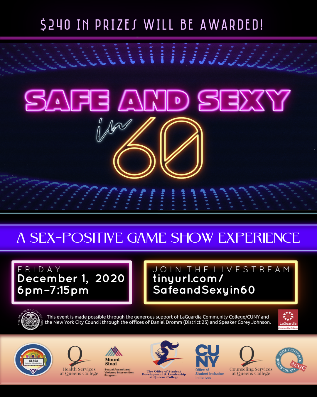 ?Hello Student Leaders. On December 1st at 6pm, please join us for Safe and Sexy in 60: A Sex-positive Game Show Experience and win great prizes!!! You'll learn how to practice safe sex, set boundaries, access resources and exercise self-care. $240 in Prizes will be awarded. The event will be livestreamed on youtube at: tinyurl.com/SafeandSexyin60 Share this not-to-be missed event with your friends!!! [cid:f97ecf1b-8b50-4b28-944f-278569b04e11]? The event is brought to you by the Queens College Office of Student Development and Leadership in partnership with LaGuardia Community College and the New York City Council through the offices of Daniel Dromm (District 25) and Speaker Corey Johnson. Co-sponsors: Queens College Gender, Love and Sexuality Alliance/GLASA, the Queens College Office of Student Development and Leadership, the Women and Gender Studies Department at Queens College, and the CUNY Office of Student Inclusion Initiatives, Queens College Health Services, QC Counseling Center, and QC Student Association are event co-sponsors. Seeya there! -JC? JC Carlson (They/Them/Theirs: What does this mean?<https://deconforming.com/they-them-pronouns/>) Student Life Events Manager LGBTQIAA+ Programs Coordinator Associate Coordinator, CUNY Queens LGBTQI+ Consortium Queens College CUNY Office of Student Development & Leadership Student Union Room LL23 65-30 Kissena Blvd Flushing, NY 11367 718-997-3952/917-659-2646