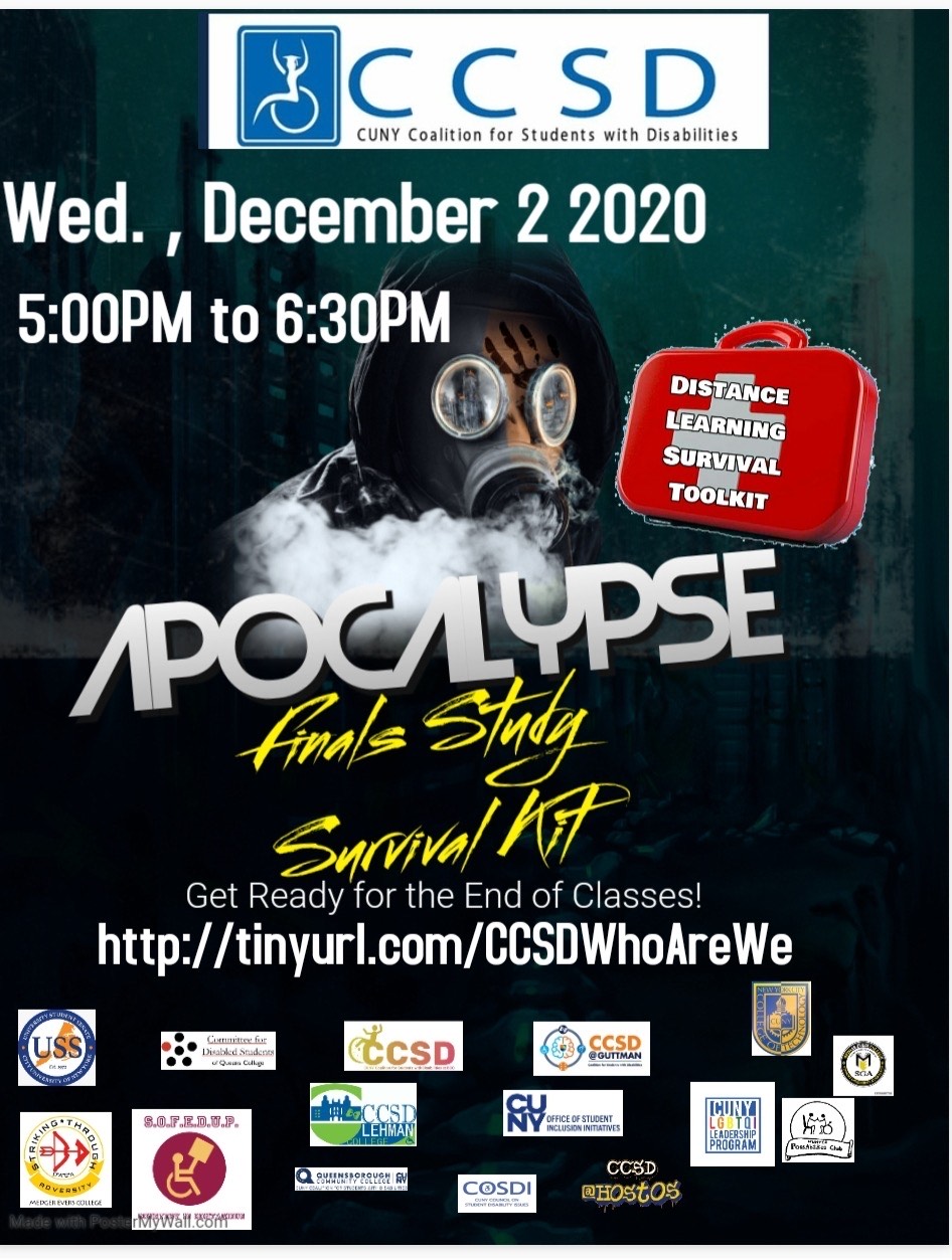 Dear Student Leaders, I hope this email finds you well. CCSD'S Who Are We Wednesdays presents THE APOCALYPSE: Distance Learning Survival Kit. During this session, in preparation for finals, we will share the tools that have contributed to student's academic success throughout this pandemic. Please see the details below along with the flyers attached and spread widely within your networks. This event is open to ALL CUNY students. Date: Wednesday December 2nd Time: 5:00 p.m. RSVP link: http://tinyurl.com/CCSDWhoAreWe<https://urldefense.proofpoint.com/v2/url?u=http-3A__tinyurl.com_CCSDWhoAreWe&d=DwMFaQ&c=mRWFL96tuqj9V0Jjj4h40ddo0XsmttALwKjAEOCyUjY&r=GlLeRO53VoQEf0Ca8jeJlXtARouyWQdaLokDJZxvkW8&m=XSozZ9B-H5BuKx-0yPD-Ltd5v_Gf6xRxXoTenNdoR5w&s=1654bFJoh0Y66oobIV5ES_eqkAW1GEJJNiMJUi_4DlA&e=> Special thanks to all that have worked so hard on our Survival Guide/Tool Kit including: * Christopher Fleming, CUNY LD Project * Raymond Perez, Advisor * Charmaine Townsel, Advisor Looking forward to seeing you all there! Hope you all have a wonderful day. Warm Regards, Luis Alvarez Chairperson CUNY Coalition for Students with Disabilities JC Carlson (They/Them/Theirs: What does this mean?<https://deconforming.com/they-them-pronouns/>) Student Life Events Manager LGBTQIAA+ Programs Coordinator Associate Coordinator, CUNY Queens LGBTQI+ Consortium Queens College CUNY Office of Student Development & Leadership Student Union Room LL23 65-30 Kissena Blvd Flushing, NY 11367 718-997-3952/917-659-2646