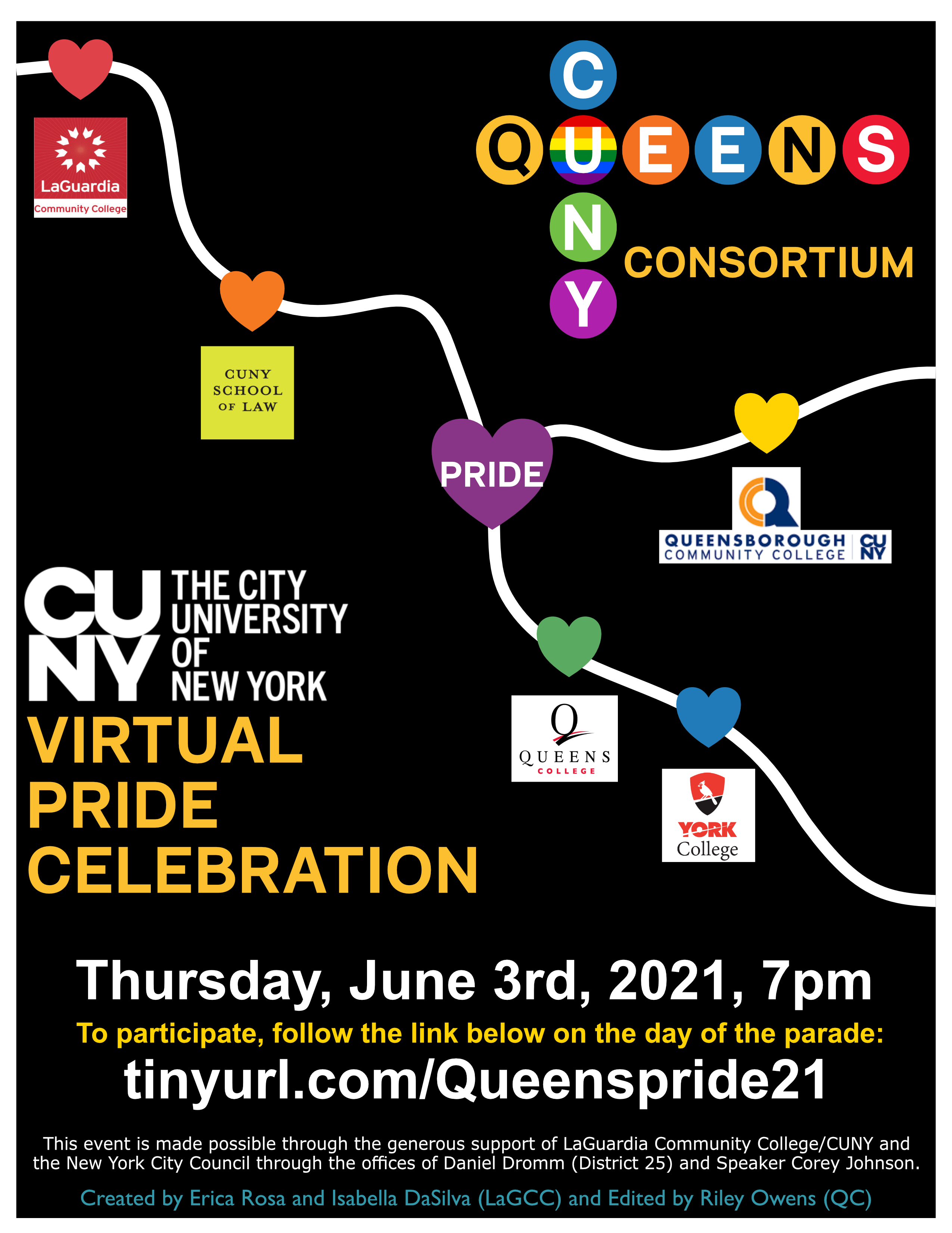 The CUNY Queens Consortium is hosting its second annual LGBTQI+ Pride Celebration on Thursday, June 3rd at 7pm. The Consortium is looking for student volunteers to lip sync at this event. If interested in providing a pre-recorded lip sync segment FEATURING YOU, then please contact the performance coordinator at cunyqueenspride@gmail.com<mailto:cunyqueenspride@gmail.com> . The performance sign-up flyer is attached. Also attached is the event flyer with the registration link. If you're wondering who the CUNY Queens Consortium is, then wonder no more. The CUNY Queens Consortium is a group of dedicated faculty and staff at Queens College, LaGuardia Community College, York College, Queensborough Community College and the CUNY Law School providing events and opportunities to all intersections of the LGBTQI+ community at the CUNY schools in the borough of Queens. Thanks a bunch. -JC JC Carlson (They/Them/Theirs: What does this mean?<https://deconforming.com/they-them-pronouns/>) Student Life Events Manager LGBTQIAA+ Programs Coordinator Associate Coordinator, CUNY Queens LGBTQI+ Consortium Queens College CUNY Office of Student Development & Leadership Student Union Room LL23 65-30 Kissena Blvd Flushing, NY 11367 718-997-3952/917-659-2646