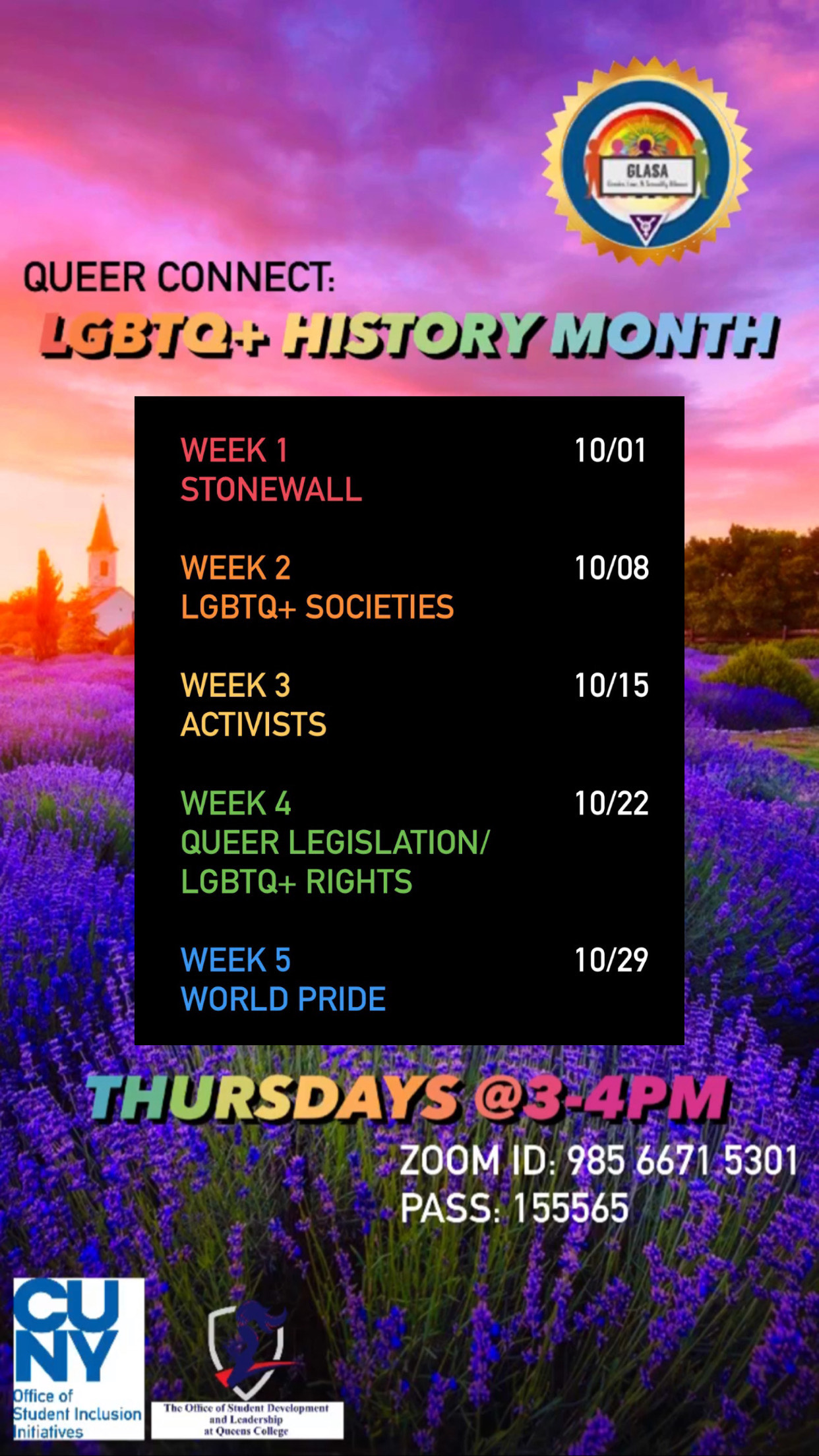 Good Afternoon. Please join GLASA every Thursday in October at 3pm as we honor LGBTQ+ History Month with a series of discussions with a special focus on the pivotal moments in our history and actual strides for equality. All are welcome. https://zoom.us/j/98566715301?pwd=b25PRGVsY25JdkxQV2U2WHBKOE1tZz09? Meeting ID: 985 6671 5301 Passcode: 155565? [cid:911114ad-9872-43a2-ba00-8c98abc05c20]? This event is co-sponsored by the Office of Student Development and Leadership and the CUNY Office of Student Inclusion Initiatives. Thanks. -JC JC Carlson (They/Them/Theirs: What does this mean?<https://deconforming.com/they-them-pronouns/>) Student Life Events Manager LGBTQIAA+ Programs Coordinator Queens College CUNY Office of Student Development & Leadership Student Union Room LL23 65-30 Kissena Blvd Flushing, NY 11367 718-997-3952
