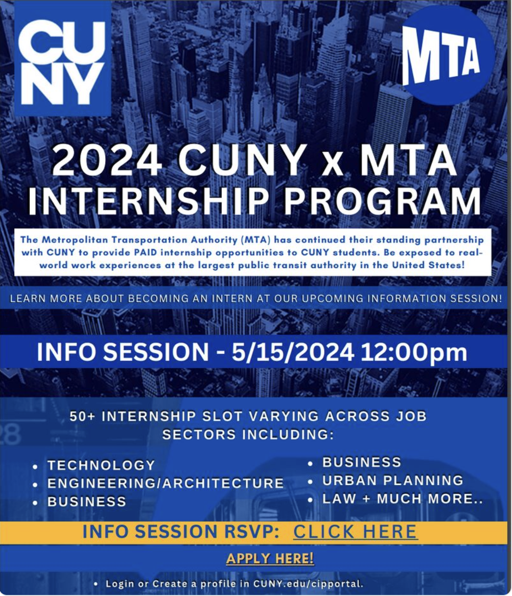 CUNY Internship Opportunities for students. https://cunyinternship-oaa-csm.symplicity.com/ ______________________________________________________ Professor Ryan C. Sperry, PhD Department of Sociology, Queens College City University of New York Director, MA in Data Analytics & Applied Social Research email: ryan.sperry@qc.cuny.edu<mailto:ryan.sperry@qc.cuny.edu> http://qcbigdata.org<http://qcbigdata.org/>