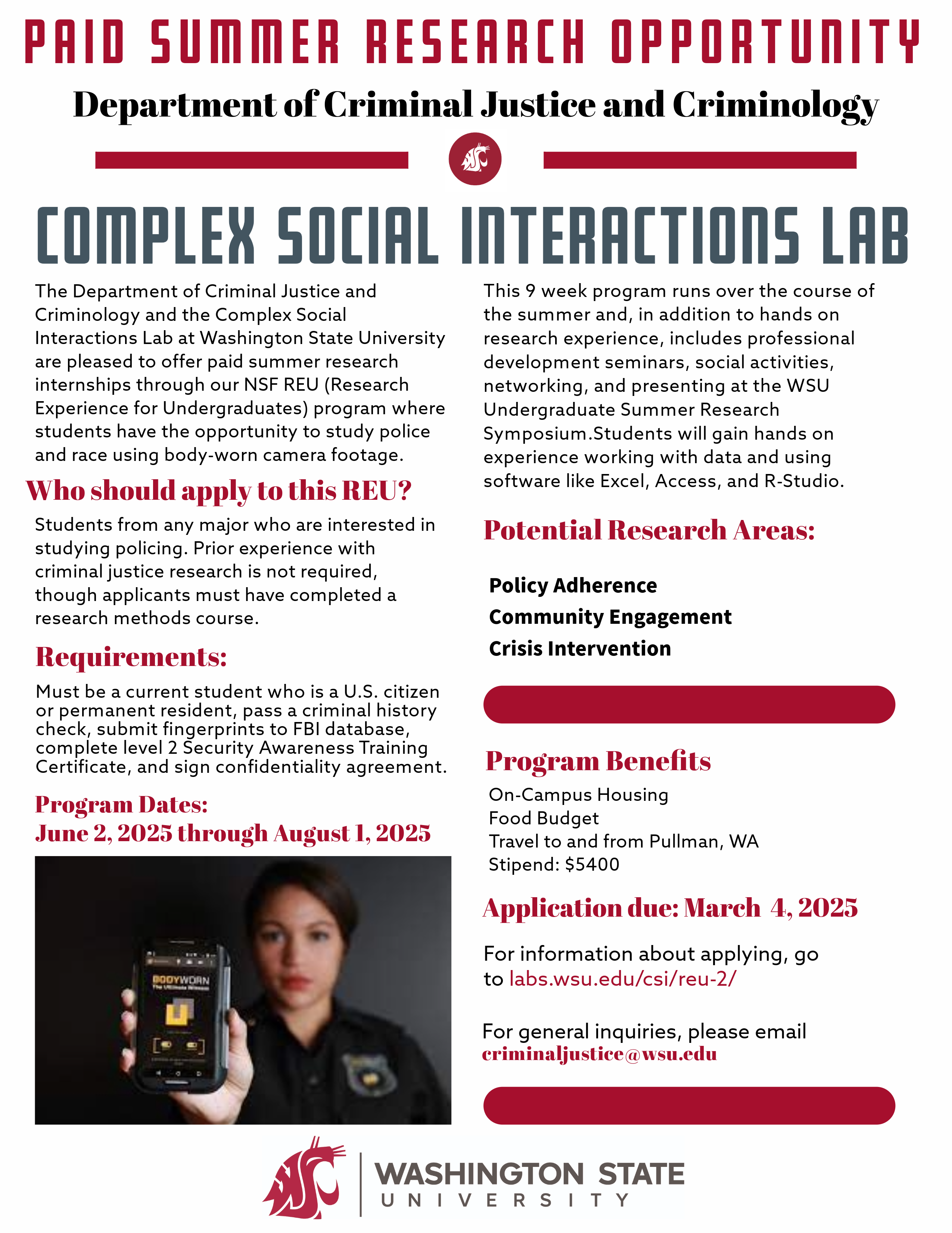 I am resending this opportunity....the system may have been down when it was originally sent. Mindy Rhindress, PhD Sociology and Data Undergraduate Departments MA Program in Data Analytics and Applied Social Research Mentor-in-Residence ________________________________ From: Mindy Rhindress <Mindy.Rhindress@qc.cuny.edu> Sent: Tuesday, February 11, 2025 6:56 AM To: Data Analytics MA Program Announcements via DataAnalyticsMAProgram <dataanalyticsmaprogram@lists.qc.cuny.edu> Subject: Fw: Paid Summer Research Opportunity REU Program - Washington State University Mindy Rhindress, PhD Sociology and Data Undergraduate Departments MA Program in Data Analytics and Applied Social Research Mentor-in-Residence ________________________________ From: Amy Hsin <Amy.Hsin@qc.cuny.edu> Sent: Monday, February 10, 2025 7:25 PM To: QCSOCLIST <QCSOCLIST@CUNY907.onmicrosoft.com> Subject: Fw: Paid Summer Research Opportunity REU Program - Washington State University FYI Amy Hsin Professor and Chair of Sociology Queens College, City University of New York Secretary, Eastern Sociological Society Chair-Elect, Asia and Asian American Section (AAA) of the American Sociological Association 2024 AAA Best Paper Award: https://academic.oup.com/sf/article-abstract/100/3/1195/6259631 Professional website: https://sites.google.com/view/amyhsin/home ________________________________ From: Larson, Melissa R <melissa.larson@wsu.edu> Sent: Monday, February 10, 2025 7:13 PM To: Larson, Melissa R <melissa.larson@wsu.edu> Cc: Willits, Dale <dale.willits@wsu.edu>; Makin, David Alan <dmakin@wsu.edu> Subject: Paid Summer Research Opportunity REU Program - Washington State University * This email originates from a sender outside of CUNY. Verify the sender before replying or clicking on links and attachments. * Dear Colleague, The Department of Criminal Justice and Criminology and the Complex Social Interaction Lab at Washington State University have been awarded a National Science Foundation grant to establish a Research Experience for Undergraduates (REU) program. We ask that you please forward this email and flyer to your undergraduate students and encourage them to consider applying. The REU site at WSU focuses on studying policing using body-worn camera footage. Students selected for the program will conduct in-person research and attend seminars and workshops over 9 weeks in the summer of 2025. Students selected for the program will receive a stipend ($5400), university housing, a food budget, and reimbursement of some travel expenses for participating in this program. Please see the attached flyer for more details. To apply, please go to: https://labs.wsu.edu/csi/reu-2/<https://urldefense.com/v3/__https://labs.wsu.edu/csi/reu-2/__;!!E8lrGBvW!u0M7xr-p5V0092jPtK5UDfvxWSf0MtgjI_4kc7E2Z_NyHKMYrD-Ipf60TdgZ2Y2wowI6oQmAcAJALTWln7bMdlFUlH69gg$> The deadline for applications is March 4, 2025. For questions, please email criminaljustice@wsu.edu<mailto:criminaljustice@wsu.edu>. [Washington State University Logo: W, S, U, letters create a cougar head.] Melissa R. Larson CSI Lab Administrator Department of Criminal Justice and Criminology College of Arts and Sciences Washington State University