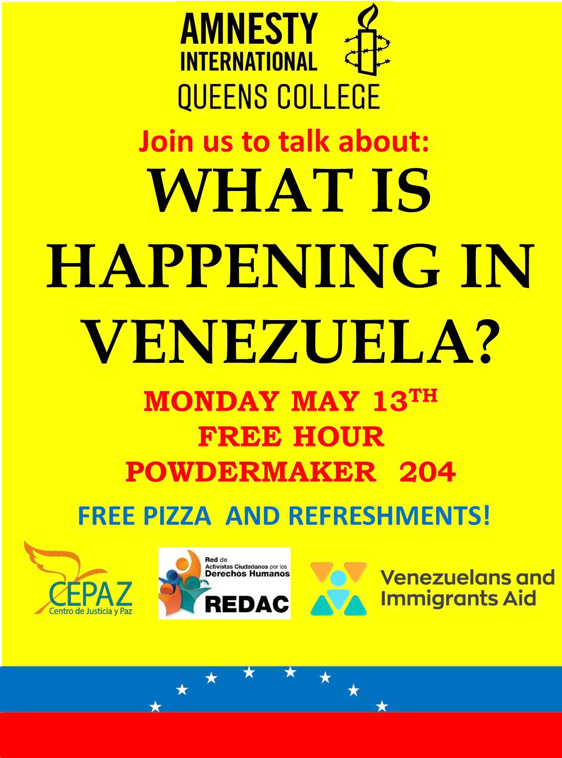 From: Tsu Zhu <Tsu.Zhu75@qmail.cuny.edu<mailto:Tsu.Zhu75@qmail.cuny.edu>> Sent: Wednesday, May 8, 2019 1:54 PM To: Tsu Zhu <tsu.zhu75@qmail.cuny.edu<mailto:tsu.zhu75@qmail.cuny.edu>> Subject: 05/13 Pizza & Talk About Current Events in Venezuela Good afternoon, We are organizing a talk next Monday 05/13 during free hour, hosted by the Queens College student branch of Amnesty International. The talk will be about the political and economic climate in Venezuela. It will be located in Powdermaker Hall Room 204. Speakers from three different organizations will be there, and pizza and refreshments will be served. I have attached the flyer to this email (PNG file). We would love it if you could join us on Monday, and if you can share it with your students who might be interested in attending as well. Thank you for your time. We hope to see you there if you can make it! Warm regards, Tsu P. Zhu Political Science