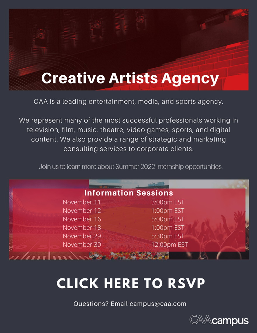 Dear students, I’m writing to share an excellent opportunity for Summer 2022 full time internships, with Creative Artists Agency. If you’re interested, I recommend attending one of the information sessions—and making an appointment with a career counselor in QC’s Office of Career Engagement<https://www.qc.cuny.edu/StudentLife/services/career/students/Pages/Student.aspx> to get help with your application. See below for more information. Jason Tougaw Professor, English English Internship Coordinator Faculty Advisor, The Knight News Queens College jason.tougaw@qc.cuny.edu<mailto:jason.tougaw@qc.cuny.edu> CAA’s 2022 Summer US Campus Application<https://urldefense.proofpoint.com/v2/url?u=https-3A__nam02.safelinks.protection.outlook.com_-3Furl-3Dhttp-253A-252F-252Fwww.caa.com-252Fcampus-26data-3D04-257C01-257Cricki.weitzen-2540caa.com-257Cdbd9928f93c94439ae9f08d99a6c13cc-257Cc8f08d7a5d314558b0cab619c9a3d60a-257C0-257C0-257C637710611262981068-257CUnknown-257CTWFpbGZsb3d8eyJWIjoiMC4wLjAwMDAiLCJQIjoiV2luMzIiLCJBTiI6Ik1haWwiLCJXVCI6Mn0-253D-257C1000-26sdata-3DWRtwLaTpiS98dTb6vra5HNu2U-252F72pBtQkiT9CD9Ss-252Fg-253D-26reserved-3D0&d=DwMF-g&c=Wi-qTpn_RgcJBhcTBvE78ikfrezXYPI95JOwqif1l1c&r=5AQamplVqZMNip09Zz4jMROQXwGeYSml5mdtTHRmzwM&m=RanQ4V7Qy0g71D4Uj07visT8Q2nV1pBNgEo3ko8ds0h5qXzNm9HKHtjHdKS-J5Z8&s=3Rs3PtndgqIaXpDFqk2jTrfriz7a8MRJPWzVH5VwlSo&e=> opened today and I would appreciate your help in spreading the word! The application is open from Monday, November 1st with a deadline of Wednesday, December 1st. Additionally, we will be hosting six virtual information sessions to speak with students about our Summer 2022 in-person internship opportunities. Candidates may RSVP for an information session here<https://urldefense.proofpoint.com/v2/url?u=https-3A__nam02.safelinks.protection.outlook.com_-3Furl-3Dhttps-253A-252F-252Fcaaenterprise.co1.qualtrics.com-252Fjfe-252Fform-252FSV-5FbpZE9Z7xdDIuEw6-26data-3D04-257C01-257Cricki.weitzen-2540caa.com-257Cdbd9928f93c94439ae9f08d99a6c13cc-257Cc8f08d7a5d314558b0cab619c9a3d60a-257C0-257C0-257C637710611262991062-257CUnknown-257CTWFpbGZsb3d8eyJWIjoiMC4wLjAwMDAiLCJQIjoiV2luMzIiLCJBTiI6Ik1haWwiLCJXVCI6Mn0-253D-257C1000-26sdata-3DXZ3x5DKlNTQELquC5rmEDTy3jBjsMiLQ9kBIJd-252BRKR4-253D-26reserved-3D0&d=DwMF-g&c=Wi-qTpn_RgcJBhcTBvE78ikfrezXYPI95JOwqif1l1c&r=5AQamplVqZMNip09Zz4jMROQXwGeYSml5mdtTHRmzwM&m=RanQ4V7Qy0g71D4Uj07visT8Q2nV1pBNgEo3ko8ds0h5qXzNm9HKHtjHdKS-J5Z8&s=fbysShkkDGgafC9Jj2m-D_loRUspsIqStLmwhlpYgiA&e=> or by clicking the hyperlink on the below info graphic. We would appreciate your support in forwarding this email to your students. Please see below for an email template that can be leveraged. If I can help by posting either the internship or info sessions, please let me know or send me the link to do so. Thank you, Ricki [Text Description automatically generated] <https://urldefense.proofpoint.com/v2/url?u=https-3A__caaenterprise.co1.qualtrics.com_jfe_form_SV-5FbpZE9Z7xdDIuEw6&d=DwMF-g&c=Wi-qTpn_RgcJBhcTBvE78ikfrezXYPI95JOwqif1l1c&r=5AQamplVqZMNip09Zz4jMROQXwGeYSml5mdtTHRmzwM&m=RanQ4V7Qy0g71D4Uj07visT8Q2nV1pBNgEo3ko8ds0h5qXzNm9HKHtjHdKS-J5Z8&s=vMxKZmNuxFhNF6WCJGCyHxMKyao2n0a3gB1wPPOd5zk&e=>