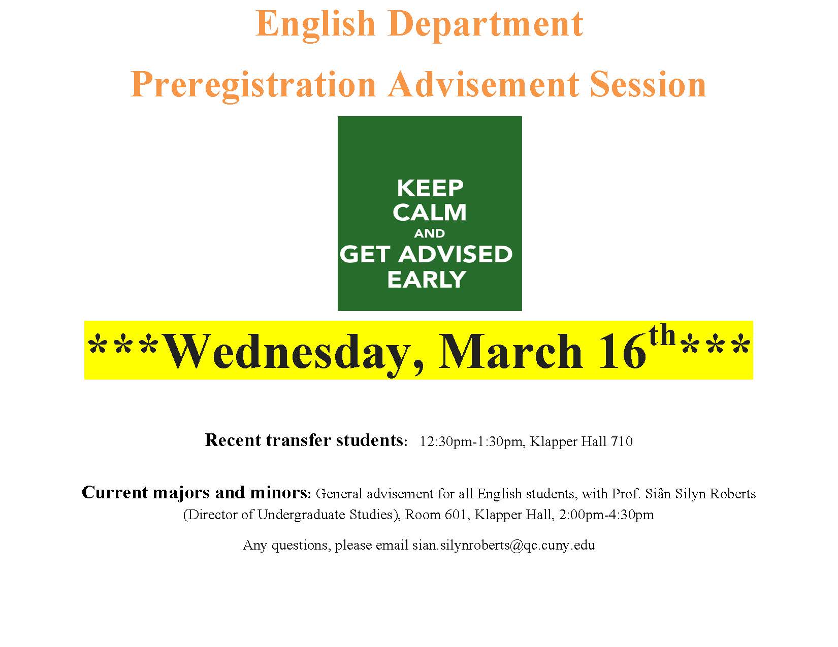 To all English majors and minors: Preregistration for Summer and Fall 2016 will take place from Tuesday, April 5th 10am-5pm until Thursday, April 7th from 10am-5pm. The following advisement sessions will be offered this Wednesday, March 16th. · Advisement for recent English transfer students, 12:30pm-1:30pm, Klapper Hall 710 · General advisement for all English students, with Prof. Siân Silyn Roberts (Director of Undergraduate Studies), Room 601, Klapper Hall, 2:00pm-4:30pm Any questions, please email sian.silynroberts@qc.cuny.edu<mailto:sian.silynroberts@qc.cuny.edu>