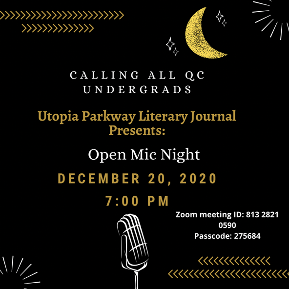 See below Sincerely, The English Department http://english.qc.cuny.edu/ Klapper 607 718-997-4600 From: Briallen E Hopper <Briallen.Hopper@qc.cuny.edu> Sent: Monday, November 30, 2020 12:20 PM Subject: Utopia Parkway Open Mic Night Dec 20 at 7 pm! Please forward! Utopia Parkway, QC's undergrad literary journal, is hosting an open mic night at the end of the semester for any and all QC undergrad students who want to read their work in a supportive and festive context. Please save the date and share this info with students who might like to participate! [cid:image001.png@01D6C723.B4E33420] Topic: Utopia Parkway Open Mic Night Time: Dec 20, 2020 07:00 PM Eastern Time (US and Canada)Join Zoom Meeting https://us02web.zoom.us/j/81328210590?pwd=M0hVM2NTN3lBSEhRbmk3Z0lSbnkvQT09Me... ID: 813 2821 0590 Passcode: 275684 One tap mobile +16468769923,,81328210590# US (New York) +13017158592,,81328210590# US (Washington D.C)Dial by your location +1 646 876 9923 US (New York) +1 301 715 8592 US (Washington D.C) +1 312 626 6799 US (Chicago) +1 408 638 0968 US (San Jose) +1 669 900 6833 US (San Jose) +1 253 215 8782 US (Tacoma) +1 346 248 7799 US (Houston) Meeting ID: 813 2821 0590 Find your local number: https://us02web.zoom.us/u/kwM81pVID