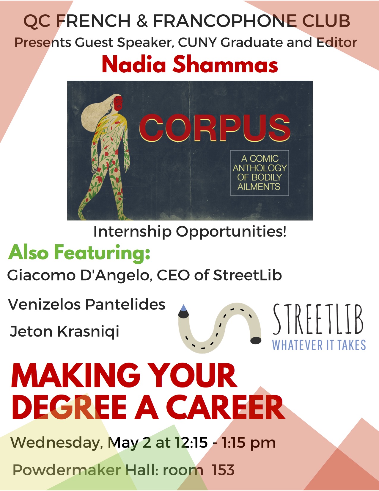 I am writing to you on behalf of the QC French and Francophone club to inform you of an event called Making Your Degree a Career, and to ask you if you could reach out to your students via email and in the classroom. It will be held on Wednesday, May 2nd from 12:15-1:15 in Powdermaker Hall: Room 153. The purpose of the event is to bring together students who study languages, literature and the arts to realize the importance of their degree and the doors that it could open for them. The main speaker is Nadia Shammas, a Brooklyn College graduate who will talk about how she raised money to fund her career, bringing together artists to form a graphic novel focused on health issues. Moreover, other speakers will discuss how their internships kickstarted their careers, and how they used their degree to form a career. Current QC students will talk about their internships with QC’s Tech Incubator, a group on campus that helps early stage student ventures build successful technology companies. Our flyer is attached below. Feel free to reach out to me with any questions or concerns you may have. All the best, Leah Herzberg Secretary of the French Club [cid:AB26687F-8969-4851-BBA7-AF69A7EDA4AC]
