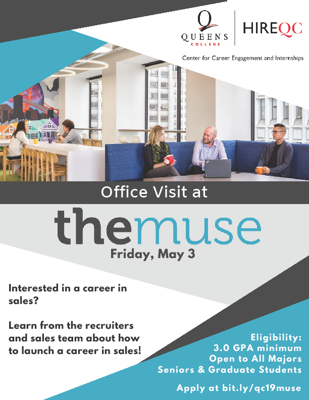 Dear English Majors, Please see the email below for an interesting job opportunity. Karen Weingarten Acting Chair, English Queens College, CUNY The Muse Office Visit (Career Development Company) We are seeking 10-20 students, who want to start a sales career, to apply for our first ever office visit to The Muse<https://www.themuse.com/> on Friday, May 3! The visit will be two hours, where students will have the opportunity to meet with some of the members of the sales team, learn about sales careers, and what it takes to be successful. A resume workshop will also be provided from the recruiting team. They are looking to recruit Sales Development Representative<https://www.themuse.com/jobs/themuse/sales-development-representative>s. A light snack will be provided. Eligibility: 3.0 GPA minimum; Seniors and Graduate students (graduating by June 2019); Interest in a sales career The exact address and time frame will be shared only to those who are approved to attend by David Engel. Interested students must apply by April 25 to be pre-screened at bit.ly/qc19muse<http://bit.ly/qc19muse>. [cid:image001.png@01D4EED6.87F3C960] David Engel Alumni & Employer Engagement Specialist Center for Career Engagement and Internships Queens College, CUNY Frese Hall Room 213 65-30 Kissena Blvd Flushing, NY 11367 W: (718) 997-4481 WWW.QC.CUNY.EDU/CAREER<http://WWW.QC.CUNY.EDU/CAREER> [QC Logo]