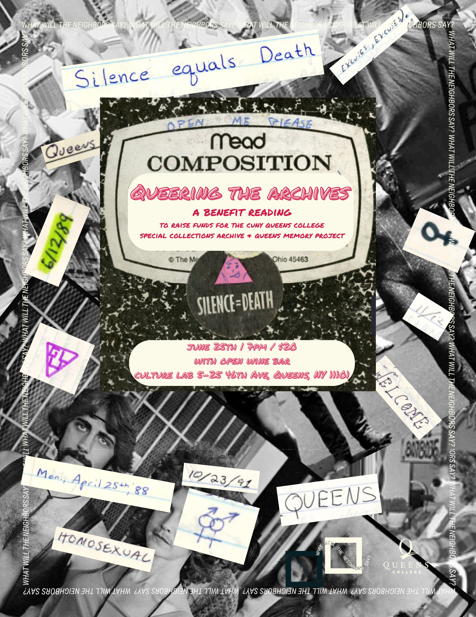 Hello everyone! Last fall, Special Collections and Archives had the great fortune to work with the theatre company What Will the Neighbors Say?<https://www.wwtns.org/> on a moving collaborative archives project—creating verbatim play Queering the Archives<https://www.theknightnews.com/2023/12/05/queering-the-archives-a-celebration-of-30-years-of-lgbtq-history-at-queens-college/> from archival materials<https://www.jstor.org/site/queenscollegearchives/glasa-journals/> in QC's own LGBTQIA+ collections. Now, we couldn't be more thrilled to announce that the Neighbors will host an encore reading of the play at a fundraiser party to benefit QC Special Collections and Archives and the Queens Memory Project. It will be a Pride celebration of queer Queens and CUNY history! We'd love it if you would join us for the reading, plus drinks, dancing, and a real fun time! Details are below and in the attached flyer: Event: Queering the Archives benefit fundraiser party Date: Tuesday, June 25 Time: 7:00 PM Location: Culture Lab LIC<https://www.culturelablic.org/> Tickets: $20 (you can purchase through the Neighbors website<https://www.wwtns.org/current-shows.html>!) We'd love to see you there! Let me know if you have any questions, and thank you! 🙂 🌈 Caitlin Caitlin Colban-Waldron | she, her Archivist, Queens College Special Collections and Archives<https://library.qc.cuny.edu/archives/> caitlin.waldron@qc.cuny.edu | 718-997-3652 Digital collections<https://www.jstor.org/site/queenscollegearchives/> | @QueensCollegeArchives<https://www.instagram.com/queenscollegearchives/>