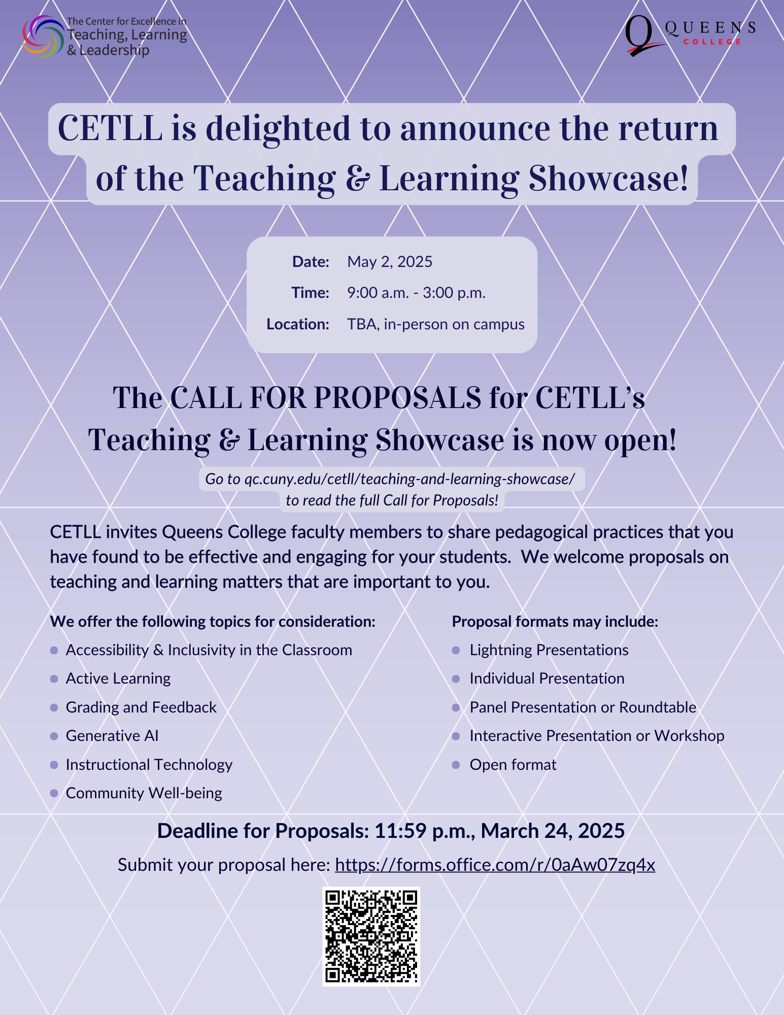 From: Patricia Price <patricia.price@qc.cuny.edu> Date: Monday, March 10, 2025 at 8:01 AM To: QC Chairs Spring 2025 <qcchairs@CUNY907.onmicrosoft.com> Cc: Bobbie Kabuto <Bobbie.Kabuto@qc.cuny.edu>, Daniel Weinstein <Daniel.Weinstein@qc.cuny.edu>, Kate Pechenkina <Kate.Pechenkina@qc.cuny.edu>, Simone Yearwood <Simone.Yearwood@qc.cuny.edu>, Soniya Munshi <Soniya.Munshi@qc.cuny.edu> Subject: Fw: CETLL Teaching & Learning Showcase: Call for Proposals Dear Chairs: please make sure your faculty are aware of this. During the time I've been at QC there has been much interest in reviving the teaching and learning showcase event. Thanks to Soniya Munshi for her leadership here! Thank you, Patricia Patricia Price, PhD (she/her/hers) Provost and Senior Vice President for Academic Affairs Queens College, City University of New York [Professional Staff Congress | Queens College] [cid:cb633575-bcc1-4060-9253-e6abdca09b00] ________________________________ From: QNS qcctlonline <CTLOnline@qc.cuny.edu> Sent: Tuesday, March 4, 2025 12:40 PM Subject: CETLL Teaching & Learning Showcase: Call for Proposals [cid:6c474e90-4a48-41b0-aa32-decbbdac7901] Thank you for your past interest in CETLL events. CETLL is delighted to announce the return of the Teaching & Learning Showcase, a day-long event that centers innovative, equitable, and student-centered pedagogical practices and projects at Queens College. Date: May 2, 2025 Time: 9:00 a.m.- 3:00 p.m. Location: TBA, in-person on campus The CALL FOR PROPOSALS for CETLL’s Teaching & Learning Showcase is now open! CETLL invites Queens College faculty members to share pedagogical practices that you have found to be effective and engaging for your students. If you have participated in any CETLL workshops, trainings, or seminars in the past, we invite you to share what you learned or developed through those experiences with this wider campus audience. We welcome proposals on teaching and learning matters that are important to you. We offer the following topics and questions for consideration: * Accessibility and Inclusivity in the Classroom: What pedagogical tools and strategies effectively support our classrooms to be more accessible and inclusive, particularly for our neurodivergent, multilingual, first-generation, transfer and/or low-income students? * Active Learning: What methods are we using in our classes to encourage students to engage in deep learning, including through opportunities to practice skills, solve problems, work with complex questions and concepts, and develop and express their ideas? * Grading and Feedback: How do our approaches to grading and assessment foster student growth and learning? How do we offer constructive feedback to our students across different courses, class sizes, and levels? * Generative AI: What are the ways we are engaging in discussion with our students about the growth of Generative AI? How are we responding to these developments through our curriculum design, assignments, and course policies? How do we use current discourse about Generative AI to open up dialogue about processes of teaching, learning, and the purpose of the classroom? * Instructional Technology: How does our use of technology-based tools support our efforts to grow student engagement, collaboration, and connection in our classes? What specific tools have been effective in meeting pedagogical goals, and how? * Community Well-being: What tools and strategies are we using to foster structures and cultures of wellness in our classroom, for our students as well as ourselves? How do we cultivate spaces in our classrooms that are able to engage in conflict and challenging dynamics without enabling harm? We welcome proposals that utilize any of the following formats: * Lightning Presentation (5 minutes): a format for a brief presentation that demonstrates a specific technology-based tool, shares an activity prompt, or otherwise showcases a specific teaching practice. * Individual Presentation (15 minutes): a format for faculty members to share strategies, tools, materials, and/or aspects of an effective teaching practice, including reflection and/or questions that have emerged. (*Please note that CETLL may group individual presentations that touch on similar themes into panels or roundtables.) * Panel Presentation or Roundtable (45 minutes): a format for several faculty members to share strategies, tools, materials, and/or aspects of an effective teaching practice, including reflection and/or questions that have emerged. The group can be made up of individual panelists or structured as a roundtable conversation among the participants. * Interactive Presentation or Workshop (30 minutes): a format for presenters to demonstrate a tool, activity, assignment or other teaching practice in a way that actively engages the audience. * Open format: We are open to other modes of sharing information and engaging in discussion at the Teaching & Learning Showcase. Please feel free to propose a different format and/or time allotment for your offering. Deadline for Proposals: 11:59 p.m., March 24, 2025. Submit your proposal here: https://forms.office.com/r/0aAw07zq4x<https://urldefense.com/v3/__https://forms.office.com/r/0aAw07zq4x__;!!E8lrGBvW!tJu_mHJWwZTP01YNk14ZVf9-h8daiL9xkE0-FBcqQU-BHSz9EmHIUHl7GS8I9wG5hPrluJ8XOndk7PD1BQDLIeJqVinCESmeY7BI$> Selected applicants will be notified on April 7, 2025. Please save the date May 2, 2025, in your calendar. Information: CTLOnline@qc.cuny.edu<mailto:CTLOnline@qc.cuny.edu> https://www.qc.cuny.edu/cetll/teaching-and-learning-showcase