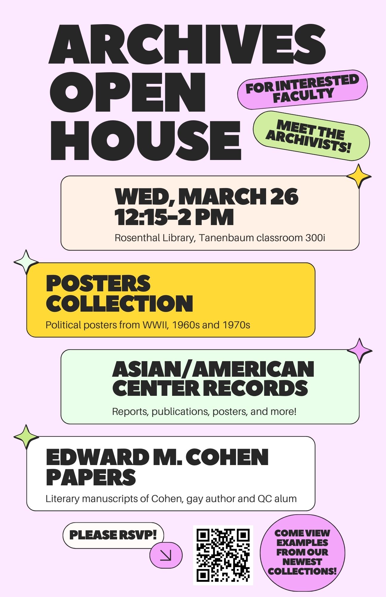 From: Annie Tummino <atummino@qc.cuny.edu> Date: Tuesday, March 4, 2025 at 5:01 PM To: James Lowry <James.Lowry@qc.cuny.edu> Cc: Caitlin Waldron <Caitlin.Waldron@qc.cuny.edu> Subject: Archives Open House 3/26 --------------------------------- Faculty and Staff: Join Special Collections and Archives on Wednesday March 26th anytime between 12:15-2pm for an Open House in the Tanenbaum Room 300i, Rosenthal Library. Drop-in to view materials from newly processed collections, and brainstorm how you might use these materials in your teaching or research. Graduate Fellows and Archives staff will be on hand to answer questions. Tea and coffee will be served! The following collections will be highlighted: · Posters collection – Political posters from social movements of the 60s and 70s; World War II propaganda posters. Beautiful designs and compelling historical content. · Asian/American Center Records – Reports, publications, posters, and other materials documenting the history of this important Center at QC and in the larger community. · Edward Cohen Papers – Literary manuscripts highlighting the creative process of gay author, playwright, and director, Edward M. Cohen, a QC alum and the award-winning author of Before Stonewall. RSVP: https://forms.office.com/r/rK7TcnEbcG Please share with other faculty that may be interested in learning more about the archives here at Queens College by forwarding this email and sharing the attached flier/image. Questions? Email qc.archives@qc.cuny.edu. -- Annie Tummino (she/her) Head of Special Collections & Archives Benjamin S. Rosenthal Library Queens College, CUNY