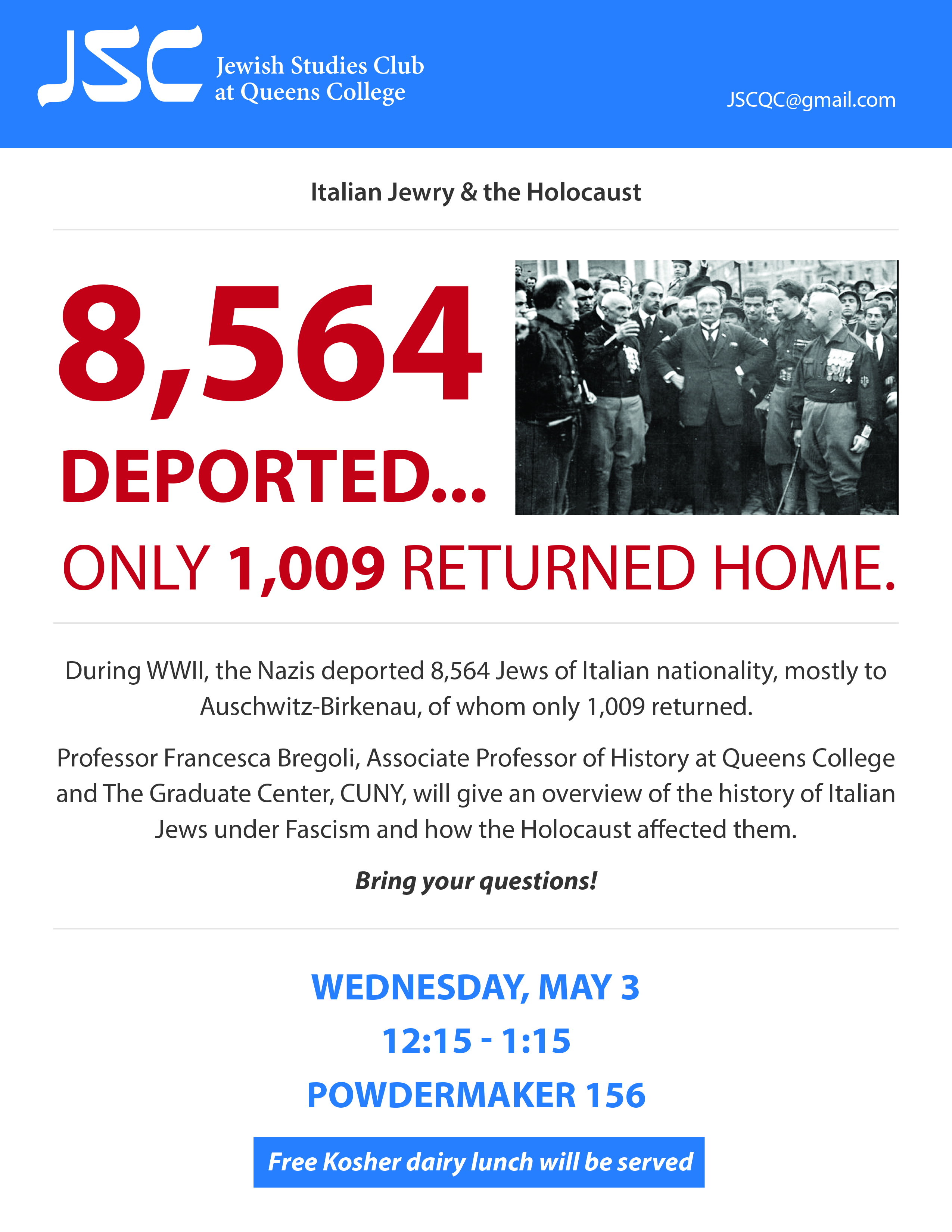 Dear History students, Please see the attached flyer for a fascinating talk by our own Prof. Bregoli on the topic of Italian Jews and the Holocaust that will take place in PH 156 on Wednesday May 3 during Free Hour. A free kosher lunch will be served. Best, Prof. Celello