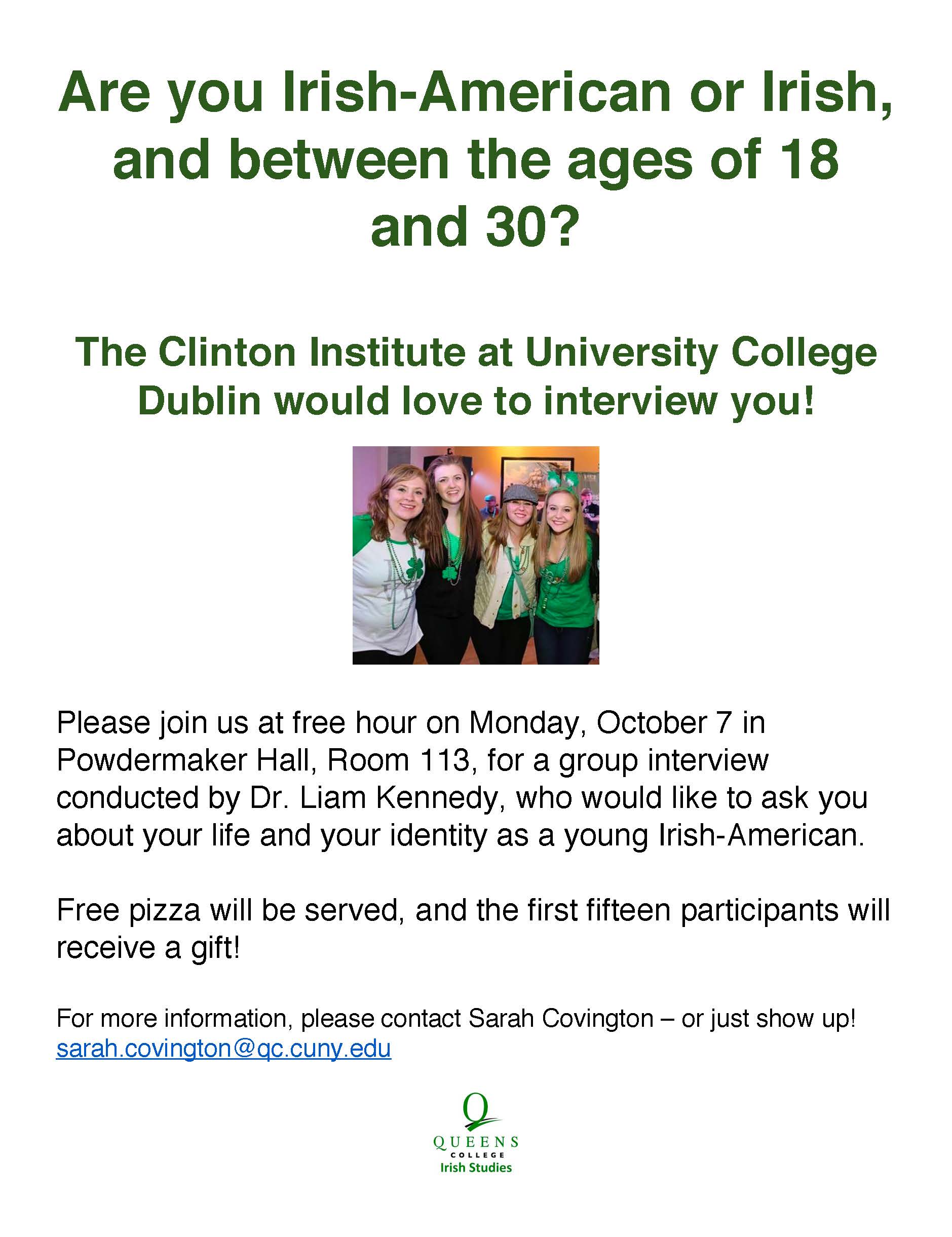 Dear History Majors, As director of the Irish Studies program at Queens College, I would like to invite you to an event this coming Monday, October 7 at free hour, in Powdermaker 113. Dr. Liam Kennedy, director of the Clinton Institute for American Studies in Dublin, will be coming to campus to conduct interviews for a research project on young Irish-Americans today. So if you're between the ages of 18 and 30, and even just partly Irish-American, please join us! We'll have free pizza and special gift cards for the first fifteen students who arrive. It would also be a nice opportunity for you to make contact with the Clinton Institute and its director. I hope to see you there, and please contact me if you have any questions. All best, Sarah Covington [cid:596720e3-0151-4d5f-a0ed-eef306d60103]