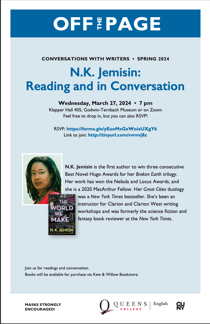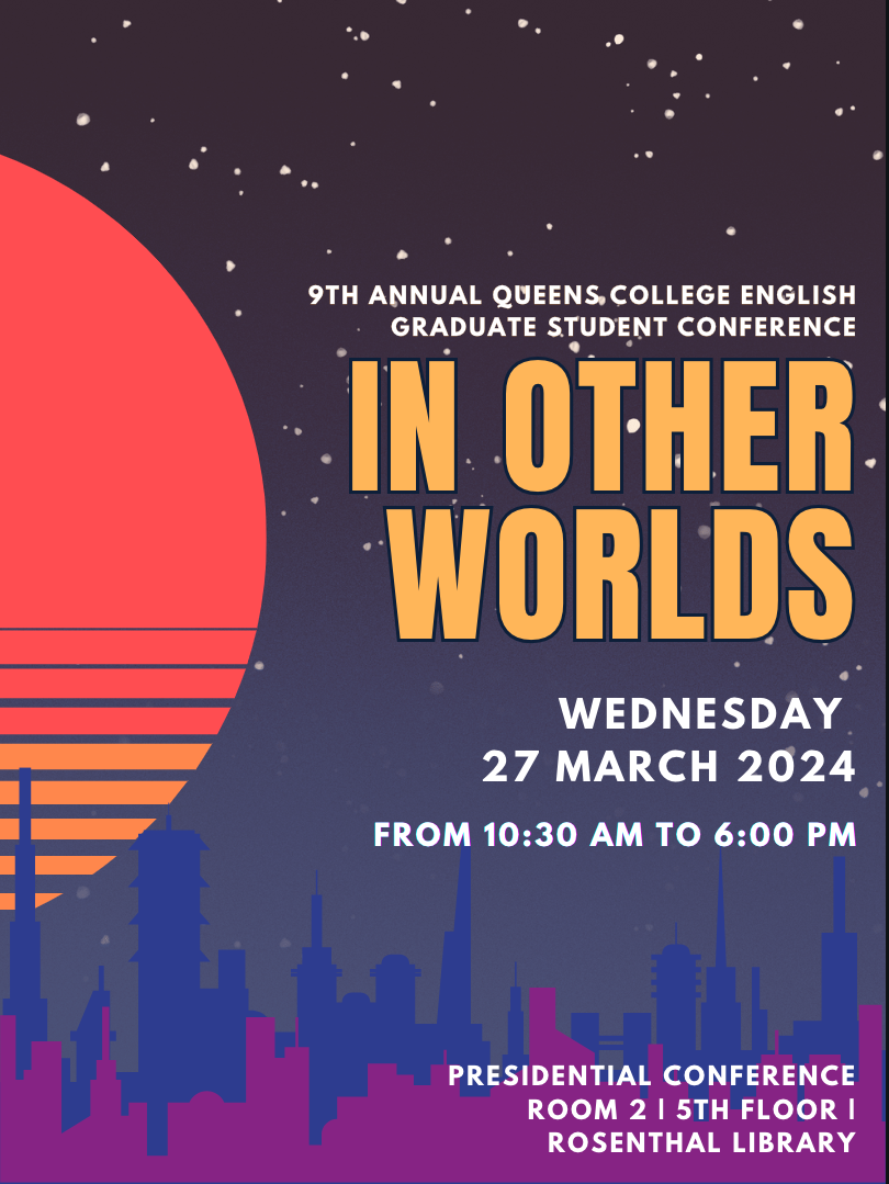 Hello all, I’m writing to remind you that the annual graduate student conference, In Other Worlds, will take place next week on Wednesday, 3/27. The conference will be held in the Presidential Conference Room 2, on the fifth floor of the Rosenthal Library, from 10:30 to 6 pm. We’ll have a lunch as well as an evening reception that will end just before NK Jemisin’s reading at the Godwin-Ternbach Museum in Klapper that evening. I’ve pasted the day’s program below. I have also attached the conference poster and the poster with information about Jemisin’s reading. We’ll have presenters from Queens College’s MA and MFA programs, as well as from St. Johns, Fordham, NYU, Hunter, Pace, Brooklyn College, and Western Washington University. We hope that you will be able to attend the conference for all or part of the day. Further information about the conference is also available on the conference website<https://inotherworlds.commons.gc.cuny.edu/>. We also still could use some students to help with the festivities. If you are able to assist that day, please get in touch with me. Best, Bill ________________________________________ William Orchard Associate Professor Director, MA Program Department of English Queens College, CUNY FINAL SCHEDULE IN OTHER WORLDS CONFERENCE 10:30 – 10:45 am: Welcome 10:45 – 12:00 pm Panel I : World Order and Disorder * Chair: Professor Caroline Hong * Noah Baum, “Tidalectic Intersubjectivity: Caribbean and Black Models of Oceanic Being” * McKenzie Mann-Wood, “Creation at the End of (This) World” * Amanda Long, “From Slow Death to Revolutionary Awakening: Melancholia as Dialectical Image” * Sana Younis, “Critical Resistance: Imagining Muslim Worlds in Speculative Fiction” 12:15 – 1:30 pm Panel II: Suspensions of Time and Space * Chair: Professor Omari Weekes * Brandon Borcoman, “The Swerve That Started It All” * Julie Goodale, “Taking Up Space: Extending the Document into Multiple Dimensions” * Sarina Sandwell, “Critical Fabulation as Utopian Hypothesis in Saidiya Hartman’s Wayward Lives” * Mosammat Z. Sultana, “Otherworlding of the Sea: Custance’s Miraculous Sea Sailing in Chaucer’s The Man of Law’s Tale” 1:45 – 2:45 pm Lunch (Klapper Hall 710) 3:00 – 4:15 pm Panel III: Remaking Institutions * Chair: Professor Chamara Moore * Hayley Blair, “Captain America v. Peacemaker” * Richard Prins, “Kusadikika and Walenisi: The Purpose of Utopia in the Swahili Novel” * Sal Sayema,“Leaving Machine Politics: Demanding Bangladeshi Student Autonomy” * Elle Schwetz, “Awareness, Apparatuses, Alienation, and Aliens!: Applying Theory of Ahmed, Althusser, and Marx to Octavia Butler’s ‘Bloodchild’” 430 – 6:00 pm Panel IV: Afterlives of Empire * Chair: Professor Megan Paslawski * Lily Alvarado, “From Bushwick to Portland: Bori Girls of the Diaspora Revolutionizing Puerto Rican Narrative” * Zaira Bardos, “Marginal Worlds: Redefining “Home” Within the Filipina Body” * Kayla Baur, “Mixed Feelings: The Emotional Appeals of Zitkala-sa’s American Indian Stories” * Lilian Chines Marzo, “Mother-Daughter Dynamics Towards a ‘Broken Language’ Repaired” * Yasmin Tehrani, “Ocean Vuong’s Entanglements in On Earth We’re Briefly Gorgeous” 6:00 – 6:45 pm Closing Reception & Awards (Klapper Hall 610) 7:00 – 8:30 pm NK Jemisin Reading (Godwin-Ternbach Museum)