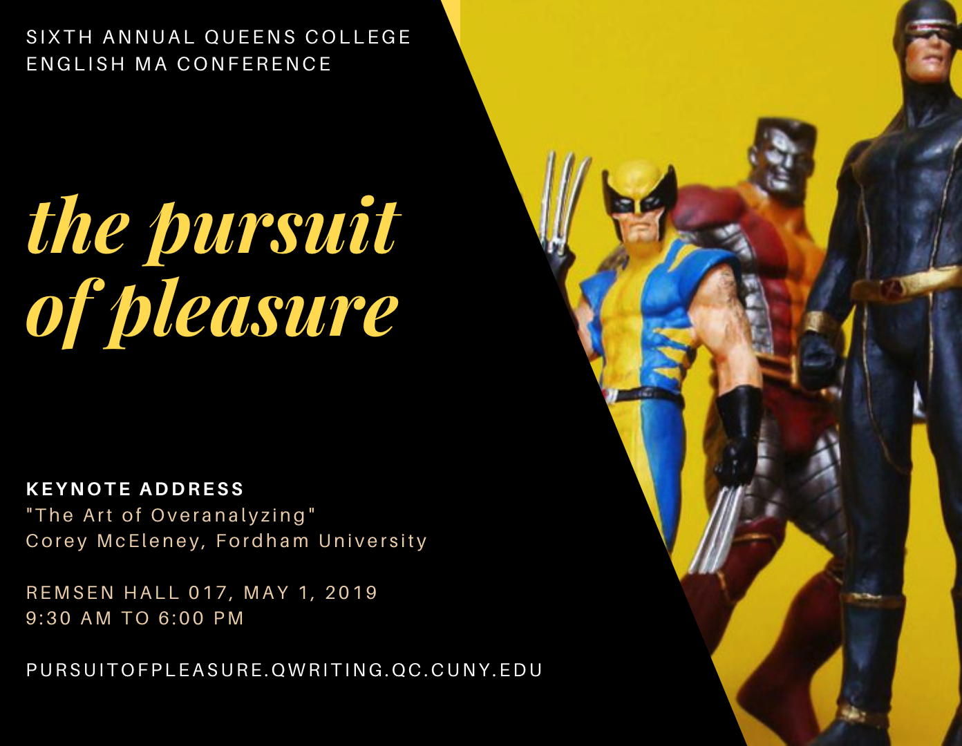 I forgot to include the conference website address: http://pursuitofpleasure.qwriting.qc.cuny.edu/ ________________________________________ From: MAEnglish <maenglish-bounces@lists.qc.cuny.edu> on behalf of William Orchard <William.Orchard@qc.cuny.edu> Sent: Friday, April 19, 2019 2:35 PM To: maenglish@lists.qc.cuny.edu Subject: [MAEnglish] REMINDER: English Graduate Conference on May 1 Dear All, I hoping you're enjoying this first day of Spring Break! As you may know, the English Graduate Conference will take place all day on Wednesday, May 1, 2019. It's a chance to hear some work by some of your colleagues as well as from graduate students from other NYC-area universities. We'll have papers on Wolverine and Batman, and Sir Francis Bacon and Thoreau, and on films like Wicker Man, A Separation, and If Beale Street Could Talk. There'll be lunch and a reception at the end of the day. The keynote address--"The Art of Overanalyzing"--by Fordham University's Corey McEleney will happen at 4:30 pm. All events are in Remsen Hall, Room 017. You can find a complete schedule and other information on the conference website. If you have any questions, feel free to contact me. We hope you can make it for part of the day!? Best, Bill