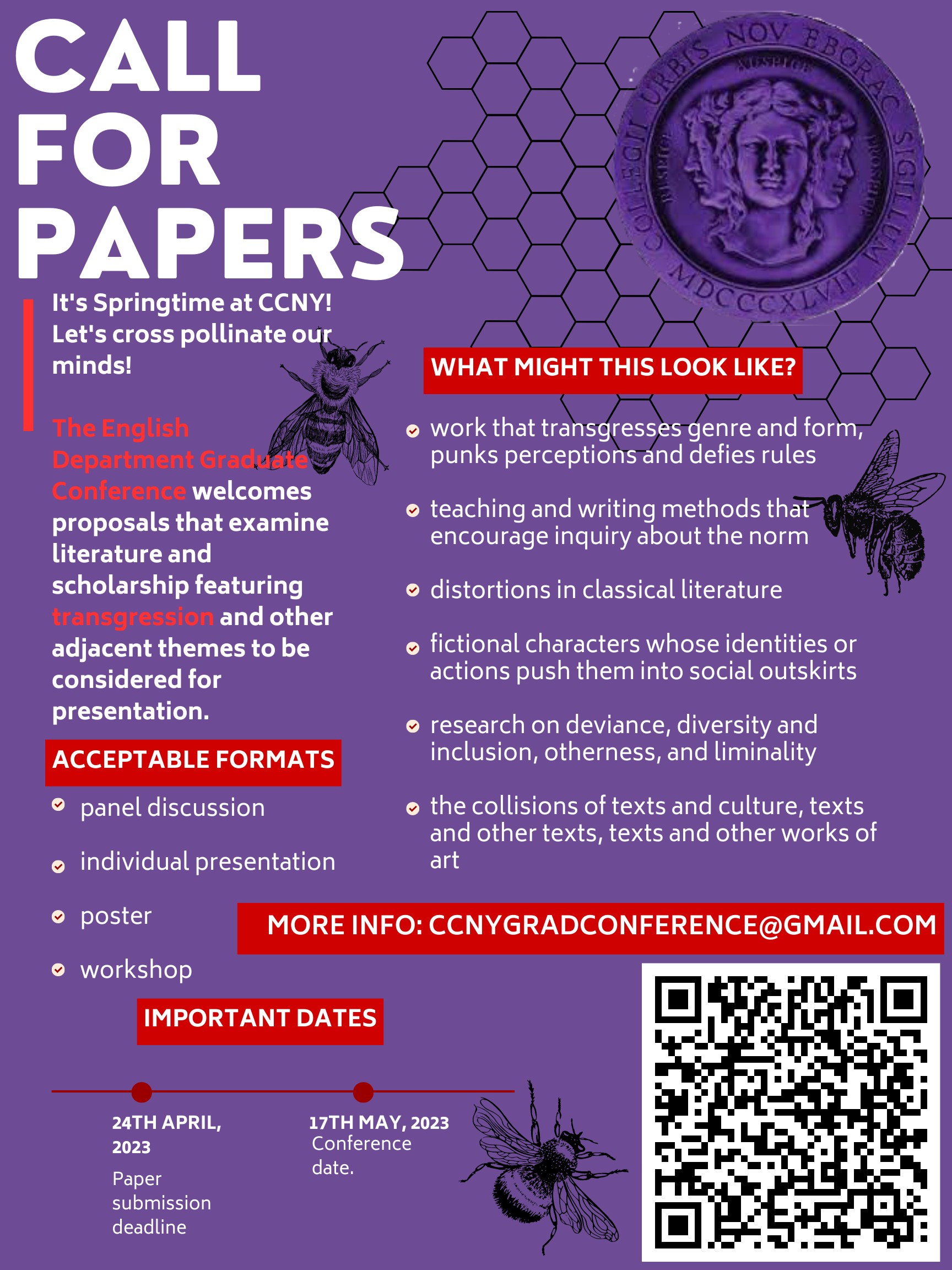 Hello all, I hope you had a great spring break. I’m writing with a reminder that, if you are planning on completing your thesis in Fall 2023, there will be an information session about it on Wednesday, April 19 at 6:30 pm. At the information session, we’ll cover: * How to register for English 791 * How to locate a thesis advisor and second reader * The timeline for completing the thesis * Best practices for approaching the thesis, which is the final culminating project for the master’s degree. We’ll also answer any and all questions you have about the process. If you plan to attend, please respond to me and I’ll provide you a Zoom link for this virtual meeting. If you can’t attend and are planning to do 791 in the fall, please let me know also so that we include in you in future mailings about the thesis. As you may know, we’ve had to postpone our conference until the fall semester. If you are interested in presenting your work this spring, CCNY’s graduate program in English is hosting a conference on transgression in May. Their deadline for proposals is April. I’ve pasted their call for papers below. Best, Bill [cid:image001.jpg@01D971B4.AE76BF10]