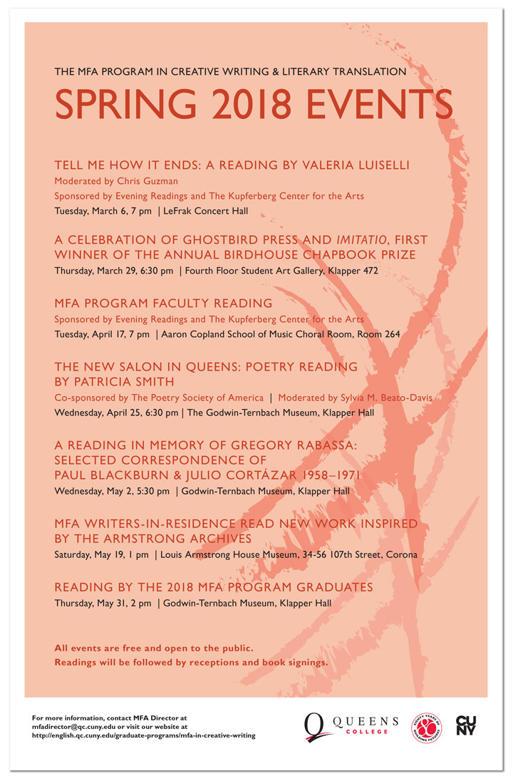 Please see the announcement below re: upcoming events from our MFA Program in Creative Writing & Literary Translation. Best, Caroline -- Caroline Kyungah Hong Associate Professor of English Director of Graduate Studies (English MA) Queens College, CUNY 65-30 Kissena Blvd. Klapper Hall 604 Queens, NY 11367-1597 caroline.hong@qc.cuny.edu ---------- Forwarded message ---------- Dear Colleagues, We are so excited to announce our spring MFA program events! We are celebrating long-time Queens College professor and brilliant translator Gregory Rabassa, bringing award-winning poet and spoken word artist Patricia Smith to campus and now partnering with the Evening Readings series for two events. Individual posters to follow, as well as postcards. Please encourage your students to attend. Best, Nicole Problem viewing this email? Click here <http://www.qc.cuny.edu/CS/MFA_CW/MFA_SpringEvent_2018.html> Click on image to download PDF [image: http://www.qc.cuny.edu/CS/MFA_CW/MFA_SpringEvent_2018.jpg] <http://www.qc.cuny.edu/CS/MFA_CW/MFA_SpringEvent_2018.pdf>