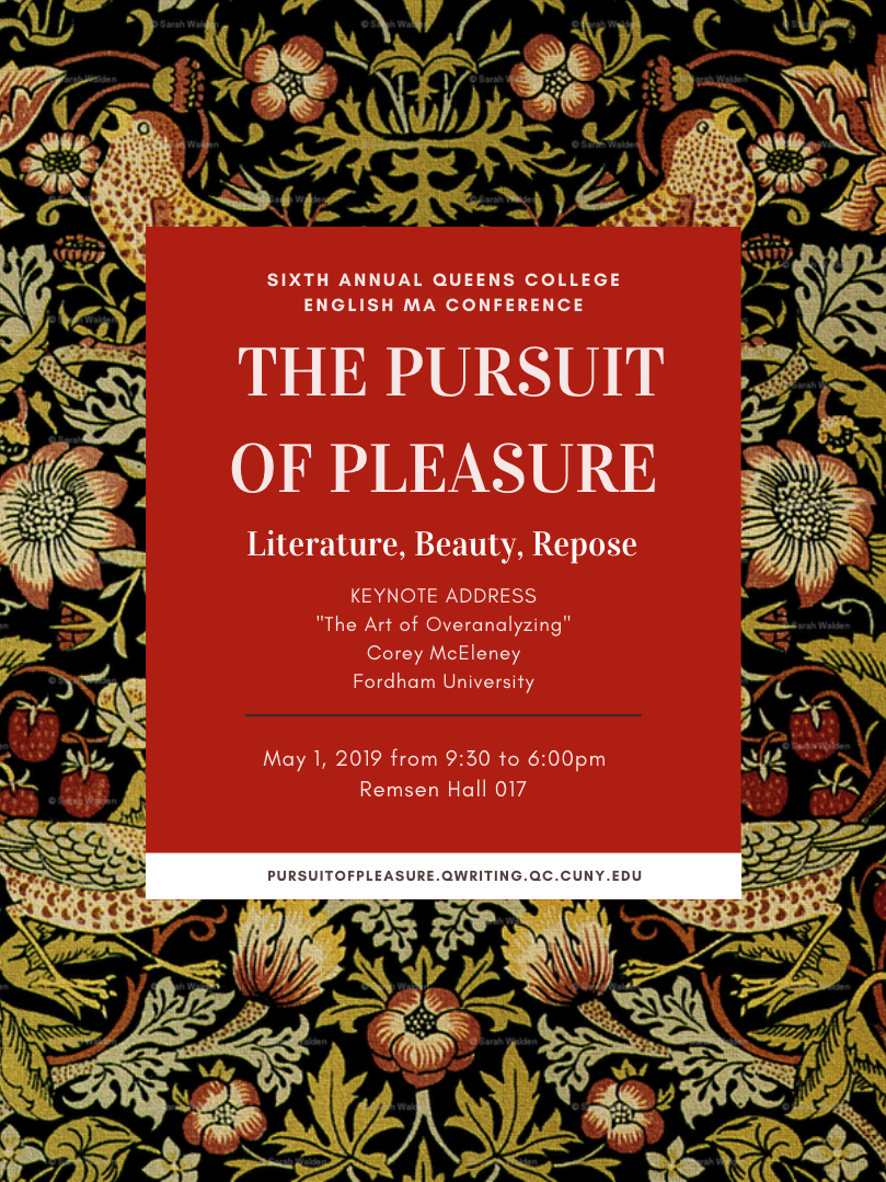 Hi all, Hope everyone had a great spring break! Just reminding you again of the busy week ahead. If you haven't already RSVPed for the *ENGL 791 workshop* tomorrow but are planning to write your thesis essay and graduate in the fall, please see below and email me ASAP. And please do plan on coming through the *MA conference* on Wednesday! In between all the free coffee and snacks and lunch and reception, you'll have the chance to hear from your peers about their research and also attend an exciting keynote on “The Art of Overanalyzing.” See below and the conference website at http://pursuitofpleasure.qwriting.qc.cuny.edu/. Best, Caroline and Bill ---------- Forwarded message --------- Dear Graduate Students, A couple reminders re: a very busy next week: *ENGL 791 in Fall 2019* If you're planning to register for ENGL 791 and write your thesis essay in Fall 2019, please join us for a workshop on *Monday, April 29, at 5:30pm*. We'll discuss the logistics and requirements for the thesis essay <http://english.qc.cuny.edu/graduate-programs/ma-in-english/ma-thesis/>, including how to sign up for ENGL 791, writing an effective proposal, finding an advisor and second reader, etc. If you haven't already, please email me ASAP to *RSVP*. Even if you're unable to make it, please let me know so we can chat about the process via email or in person. *MA Conference* A reminder that our 6th annual English Graduate Conference, "THE PURSUIT OF PLEASURE, is next *Wednesday, May 1, from 9:30am-6:30pm*, just across the quad in Remsen Hall 017! Check out the conference website for the full schedule and other info: http://pursuitofpleasure.qwriting.qc.cuny.edu/. Please come support your brilliant peers as they present their work and for Corey McEleney's exciting keynote, “The Art of Overanalyzing,” at 4:30pm. There will be free coffee, lunch, and a reception to follow the keynote. [image: pursuit ofpleasure.png] Please note that my regular office hours on Wednesday the 1st are canceled, but you can find me at the conference all day! Hope you're enjoying a restful (and/or productive) spring break! Best, Caroline -- Caroline Kyungah Hong Associate Professor of English Director of Graduate Studies (English MA) Queens College, CUNY 65-30 Kissena Blvd. Klapper Hall 604 Queens, NY 11367-1597 caroline.hong@qc.cuny.edu