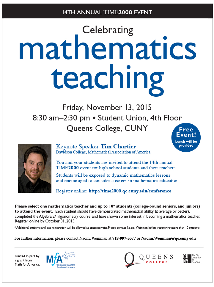 Dear Alumni, Please forward this invitation to high school math AP's, math teachers and principals. Thank you. Naomi Weinman *********************************************************************************************************** Problems viewing this email? Click here<http://www.qc.cuny.edu/CS/TIME2000/Time2000_Flyer_FA15.html> Click on image to download PDF [cid:image001.png@01D1004E.50973170][Queens College - Time2000, FA15]<http://www.qc.cuny.edu/CS/TIME2000/Time2000_FA15.pdf> =