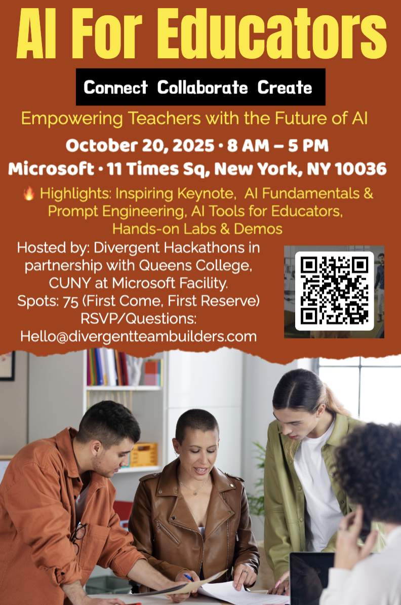Dear All, Please see attached and below for an AI for Educators event that may be of interest to you. Naomi Weinman TIME2000/SEYS Queens College, CUNY | 65-30 Kissena Blvd | Queens, NY |11367 (w) 718-997-5377 | (f) 718-997-5173 TIME2000.qc.cuny.edu<https://www.qc.cuny.edu/academics/seys/time-2000/> Donate to TIME 2000<http://bit.ly/time2000> From: Salvatore Garofalo <Salvatore.Garofalo@qc.cuny.edu> As discussed, please find attached the flyer for the AI Workshop in Education at Microsoft's office in Times Square on Monday, October 20. This is a day where no classes are scheduled at NYC schools and Queens College. Please share with alumni from last five years and current math ed students. Here is a link for registration as well: https://forms.office.com/r/WPvi99vyS7 The QR code on the flyer also works. If you or any of the faculty members are planning to attend, they should also register via the link. Thank you! Regards, Sal Dr. Salvatore Garofalo, Assistant Professor Secondary Science & Technology Education Program SciTech-TEAMS Research Associate Queens College City University of New York 65-30 Kissena Blvd Queens, NY 11367