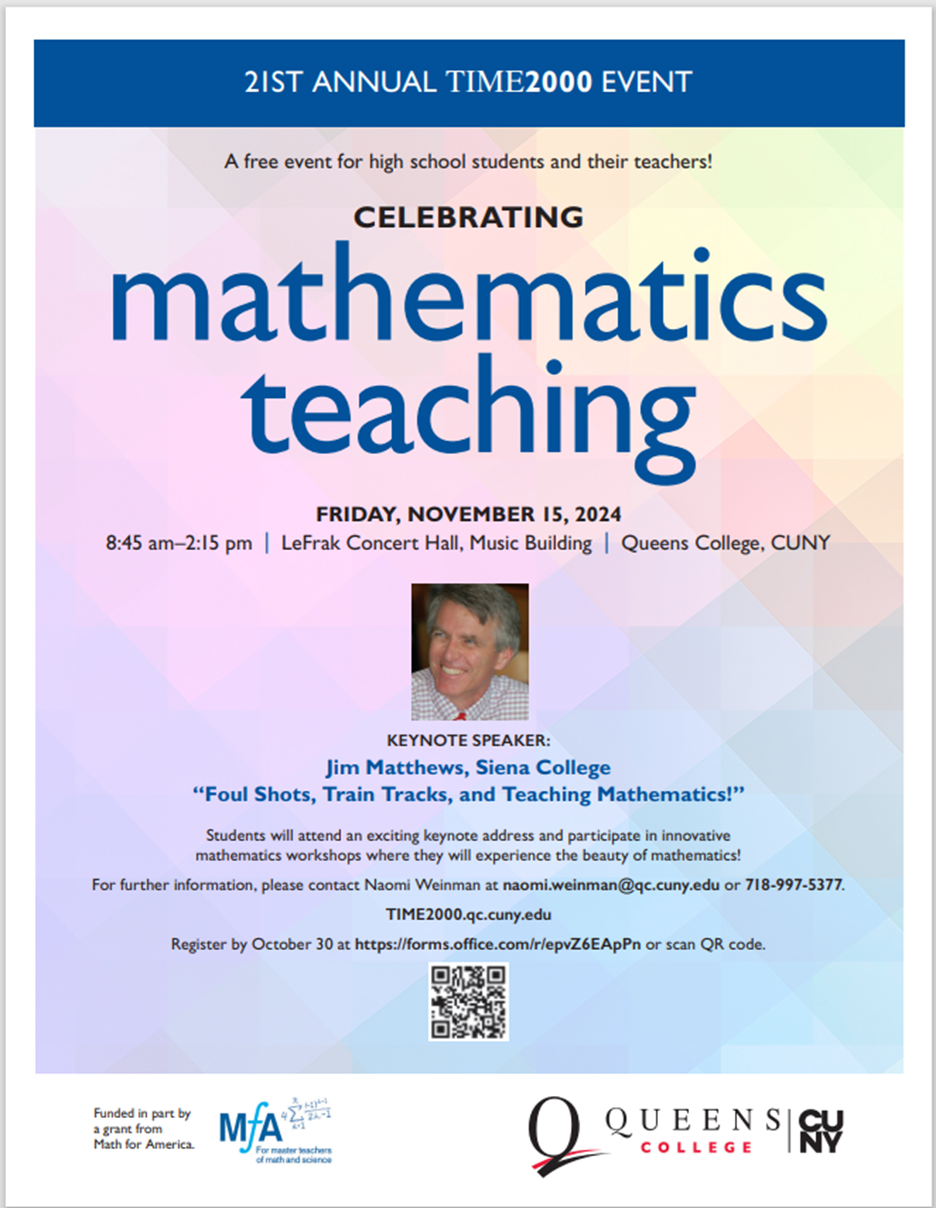 Dear Math Methods Students, I hope the semester is going smoothly! You are invited to a special event, the TIME 2000annual conference for high school students and their math teachers. At the event, there will be a fabulous keynote speaker followed by 2 workshop sessions where you could learn excellent ideas for future lessons. If you would like to attend, please rsvp by replying to this email by October 31st. TIME 2000 students do not need to reply as they will be in attendance. Remember to make arrangements/change your observation day if plan to attend. Invitation and agenda are below. Sincerely, Mrs. Weinman Naomi Weinman TIME2000/SEYS Queens College, CUNY | 65-30 Kissena Blvd | Queens, NY |11367 (w) 718-997-5377 | (f) 718-997-5173 TIME2000.qc.cuny.edu<https://www.qc.cuny.edu/academics/seys/time-2000/> Donate to TIME 2000<http://bit.ly/time2000> [cid:image008.png@01DB1F0C.AE45F310] [cid:image009.png@01DB1F0C.AE45F310]