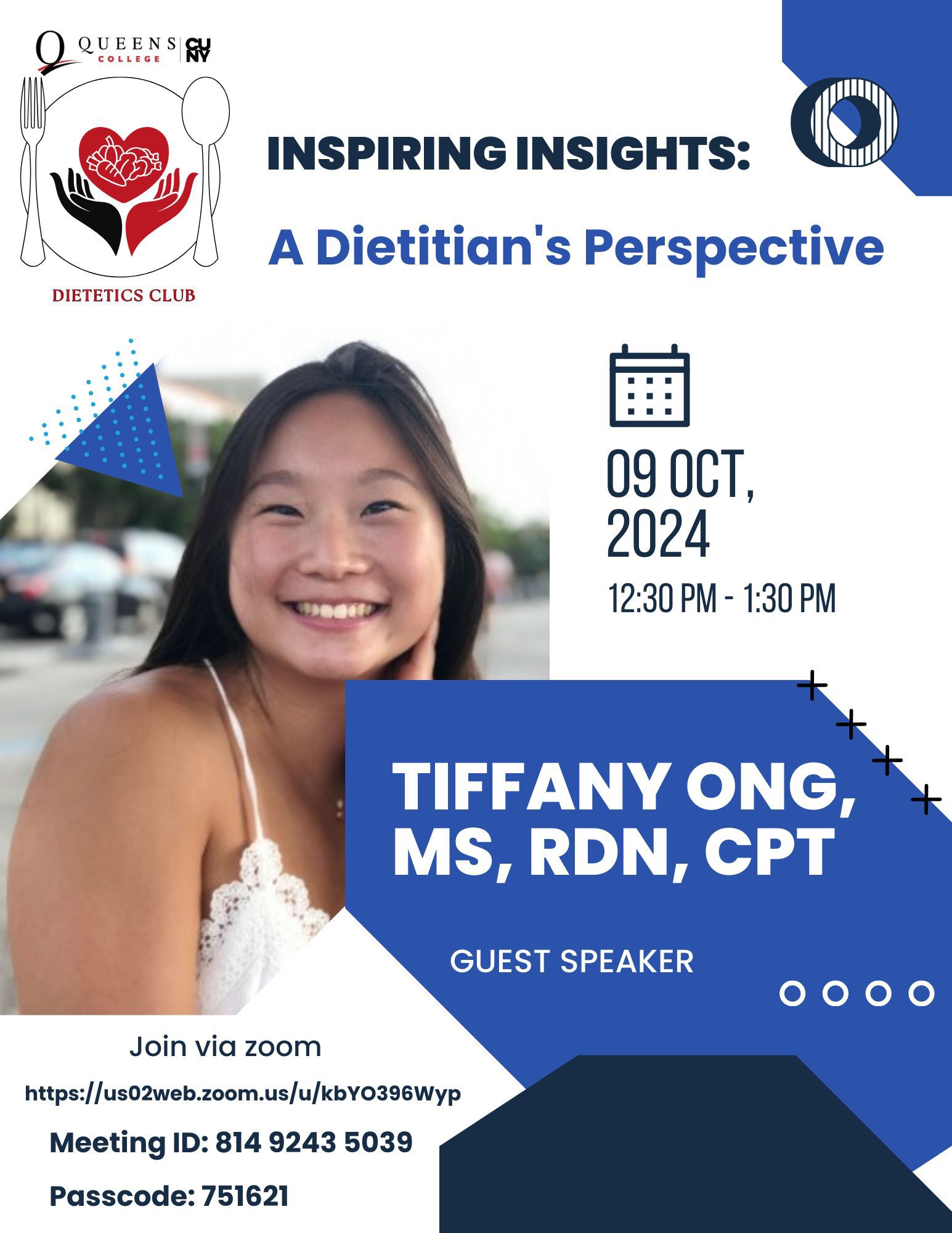 Hello everyone! You're invited to our next club meeting Via Zoom! Join us for an inspiring conversation with guest speaker: *Tiffany Ong, MS, RDN, CPT* *Date:* Wednesday, October 9th *Time:* 12:30 pm (during Free Four) *Zoom link: * https://us02web.zoom.us/j/81492435039?pwd=Mj7NmNZsVcEr4b8jGvEIq6LbI8bxl4.1 *Guest Speaker:* *Tiffany Ong, MS, RDN, CPT* A multifaceted healthcare professional who combines her expertise as: • Registered Dietitian (RDN) • Pastry Chef • Powerlifter • Certified Personal Trainer Tiffany will share her unique experiences and insights. Come prepared with questions! We look forward to seeing you there! -- *Carolina Juca* | Secretary Qc Dietetics Club *Email:* qcdieteticsclub@gmail.com [image: created with MySignature.io] <https://www.instagram.com/qc_dieteticsclub/>
