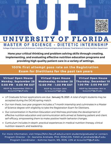 ---------- Forwarded message --------- From: Patricia K Miner <Patricia.Miner@qc.cuny.edu> Date: Tue, Sep 1, 2020 at 4:40 PM Subject: Fw: University of Florida MS-DI Virtual Open Houses To: QC Dietetics Club <qcdieteticsclub@gmail.com> We hope you are doing well and taking care during these wild times! I am reaching out to invite your students to one of the three virtual open houses we are offering this fall. - Monday, September 28th from 5:00 – 6:00pm EST - Wednesday, October 28th from 12:00 – 1:00pm EST - Thursday, December 10th from 1:00 – 2:00pm EST *Please share our MS-DI Open House flyer (attached) with your senior dietetic students.* Additional information about our program may be found at https://fshn.ifas.ufl.edu/current-students/graduate/ms-dietetic-internship-p.... *Interested students should to RSVP* *to kcounts77@ufl.edu <kcounts77@ufl.edu> prior to the specified deadlines (attached).* The virtual meeting room link and additional information will be emailed to them directly, after they RSVP. If you or your students have any questions about our program, please feel free to contact me (kcounts77@ufl.edu) or our MS-DI Program Director, Dr. Jeanette Andrade (jandrade1@ufl.edu). Thank you! Kohrine *____________________________________________________________* *Kohrine Counts Hazim, MS, RDN, LDN* *DPD & MS-DI Program Coordinator* *University of Florida | Food Science & Human Nutrition Department* Office: 103B FSHN (Advising Office) Mailing Address: FSHN Department, P.O. Box 110370, Gainesville, FL 32611 E-mail: kcounts77@ufl.edu Phone: (352) 294-3745 DPD website <https://fshn.ifas.ufl.edu/current-students/undergraduate/didactic-program-in-dietetics-dpd/> MS-DI website <https://fshn.ifas.ufl.edu/current-students/graduate/ms-dietetic-internship-program/> [image: A screenshot of a social media post Description automatically generated] -- [image: created with MySignature.io] <https://mysignature.io/?utm_source=logo> Erica Gambino | President | Qc Dietetics Club | mobile: (646) 312 - 9531 | email: qcdieteticsclub@gmail.com [image: created with MySignature.io] <https://www.instagram.com/qc_dieteticsclub/> <https://mysignature.io/editor/?utm_source=freepixel>