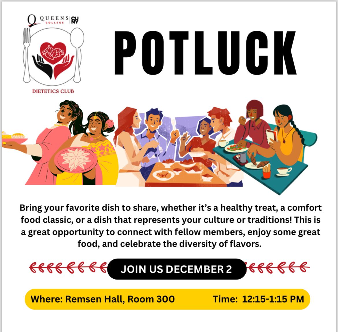 Hello everyone! We hope everyone had a wonderful thanksgiving with family and friends! To celebrate the end of the semester and share quality time together, we're organizing a potluck. *Date:* Monday, December 2, 2024 *Time:* 12:15-1:15 pm (Free Hour) *Location*: Remsem Hall, Room 300 Please bring your favorite dish to share! Looking forward to seeing you all there! -- *Carolina Juca* | Secretary Qc Dietetics Club *Email:* qcdieteticsclub@gmail.com [image: created with MySignature.io] <https://www.instagram.com/qc_dieteticsclub/>