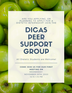 Hi Everyone! The QC Dietetics club is excited to announce a new DICAS Peer Support Group developed by current FNES student, Nancy Platt! This program is open to all. It’s goal is create an environment where students can support students around the DICAS application process! Starting Wednesday, November 25th, this peer support group will meet weekly to set goals, help answer questions, and foster an overall culture of accountability. If you are interested in joining this group, please take this survey so we can help tailor this program to your needs! https://docs.google.com/forms/d/e/1FAIpQLSdRAxHg4RcvgVp3FrgJtjcviSPJxV6X7TJF... <https://docs.google.com/forms/d/e/1FAIpQLSdRAxHg4RcvgVp3FrgJtjcviSPJxV6X7TJF6_vWUEzsnF9b0g/viewform?usp=sf_link> ---------------------- Worried about the DICAS process? Feeling anxious about applying for dietetic internships? Want to know more about what it takes to apply for an internship? Establish Goals, Talk Through Issues and Stay Motivated; Join the DICAS Peer Support Group! Group objective: The DICAS Peer Support Group is all about getting dietetic students who applying for, or planning to apply for, dietetic internships together for support. This is an opportunity to gain knowledge about the process of applying from peers going through the same thing you are, or planning to. It is based on goal setting and accountability so that everyone stays on track. But most importantly, we are gathering to support one another through this process during a time of isolation. What will we do? Everyone will get a chance to talk about their future goals and any comments, concerns, and questions about how they plan to get there, or even where to start. As a group, we will try to respond to each participant after another participant has spoken. This will help everyone determine their SMART (specific, measurable, attainable, relevant and time-based) goals to achieve before our next meeting. Kick-off Meeting will be on Wednesday, November 25th at 12:15pm. Zoom Meeting Invitation: Topic: DICAS Peer Support Group Time: Nov 25, 2020 12:15 PM https://us02web.zoom.us/j/87684473618?pwd=THppOGF6T29uN1hWTGgxU0F2NkhnQT09 <https://us02web.zoom.us/j/87684473618?pwd=THppOGF6T29uN1hWTGgxU0F2NkhnQT09> Meeting ID: 876 8447 3618 Passcode: 091489 If you have any questions please feel free to e-mail Nancy Platt at nancysarahplatt@gmail.com <mailto:nancysarahplatt@gmail.com>