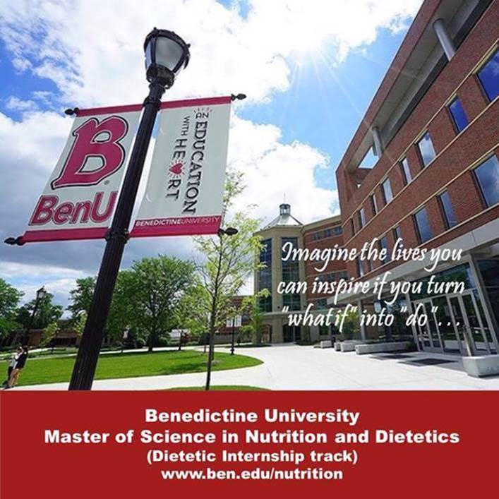 Resend with corrected attachments MS in Nutrition and Dietetics with Dietetic Internship track - or online option We offer 3 tracks: - MS in Nutrition and Dietetics with accredited Dietetic Internship - MS in Nutrition and Dietetics *online* for those matched to a Dietetic Internship elsewhere - MS in Nutrition and Dietetics *online* for those who are already Registered Dietitians We also offer a MS in Nutrition and Wellness for those not currrently seeking the RD credential. Visit www.ben.edu/nutrition for more information! *Dr. Catherine Arnold, MS, EdD, RDN, LDN* Professor and Department Chair Nutrition l College of Education and Health Services 5700 College Rd. l Lisle, IL 60532 Email: carnold@ben.edu Office: (630) 829-6534 Office Fax: (630) 829-6595 l www.ben.edu/nutrition Follow us: facebook.com/benedictineuniversity [image: cid:fc7f23f5-3013-4b59-9f61-cdfaf3f0fca1] -- *Marlee Hirsch* | Secretary Qc Dietetics Club *Email:* qcdieteticsclub@gmail.com [image: created with MySignature.io] <https://www.instagram.com/qc_dieteticsclub/>