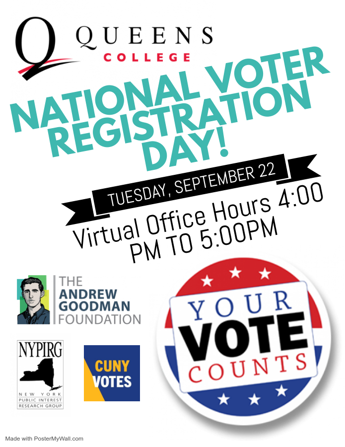 The Andrew Goodman Foundation will host a Zoom Town Hall about voter registration today, Tuesday, 9/22, 4pm-5pm. If you have questions about anything related to voting, we urge you to attend. RSVP at https://docs.google.com/forms/d/e/1FAIpQLScqxaY-PXQXwSq_51N7VlNlsdiP8YsVBNEYri1tzAg3RNBTDg/viewform<http://r20.rs6.net/tn.jsp?f=001zpCpMmdOPEArDfz_YorzKL_yFQYyGCbR3ANxhIFFwzLUZbGv68L6BqjhyUwJHLFVl5bW3xZCBg_YUAxqft8Tc3g_z7hfoAHO-6HrpQ46nx54hyXPEEufo3bphnlFqRix8pGxTSpxJpklub3368Mfi9YfYXJoL-6-QD4bUAmrEWec7aVxMM2dlPrdVHsVY7VCUNl8bspWqzoPVpf9fIy2qZtr_kXxyroNJtVo2TJPVYcDuQUBUnNhCQa1dhciC0rnYVCodpEFDG2ZUOJmzyniZZDp63Z8uGud&c=itxyFXzgApiPriqZtnekiptjGDRJ1nlJ_7VrOjzbzFymDqOPHqvg1g==&ch=H15rBrMVhNA7LGpLfpcAx18TfMXQkDSn5DWOkSBXwZj-FHX_UiEjSg==>. A Zoom link will be sent to you after you complete the Google form. Please feel free to let students know. For more information, email qcandrewgoodmanfoundation@gmail.com<mailto:qcandrewgoodmanfoundation@gmail.com>. Best, [A close up of text on a white background Description automatically generated]