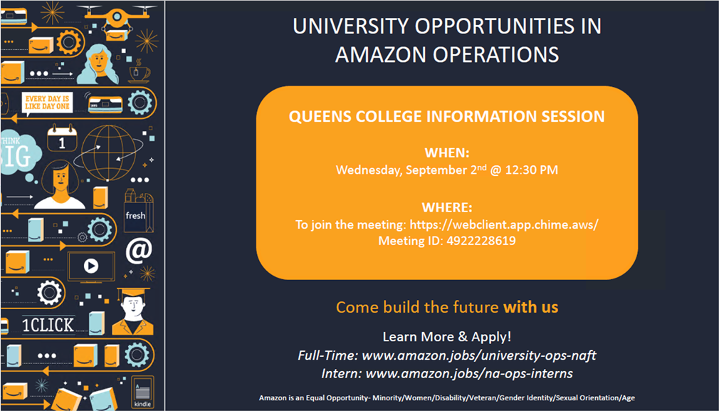 Good Afternoon Student Affairs, On behalf of Zavi, I am sharing an upcoming Amazon event for Queens College students and alumni. This virtual information session is for operations recruitment. It is scheduled for Wednesday, September 2nd at 12:30 pm. Amazon is among the top employers recruiting during COVID<https://www.linkedin.com/feed/news/heres-whos-hiring-right-now-4525187/>. [A screenshot of a cell phone Description automatically generated] Flyer is attached. Best,
