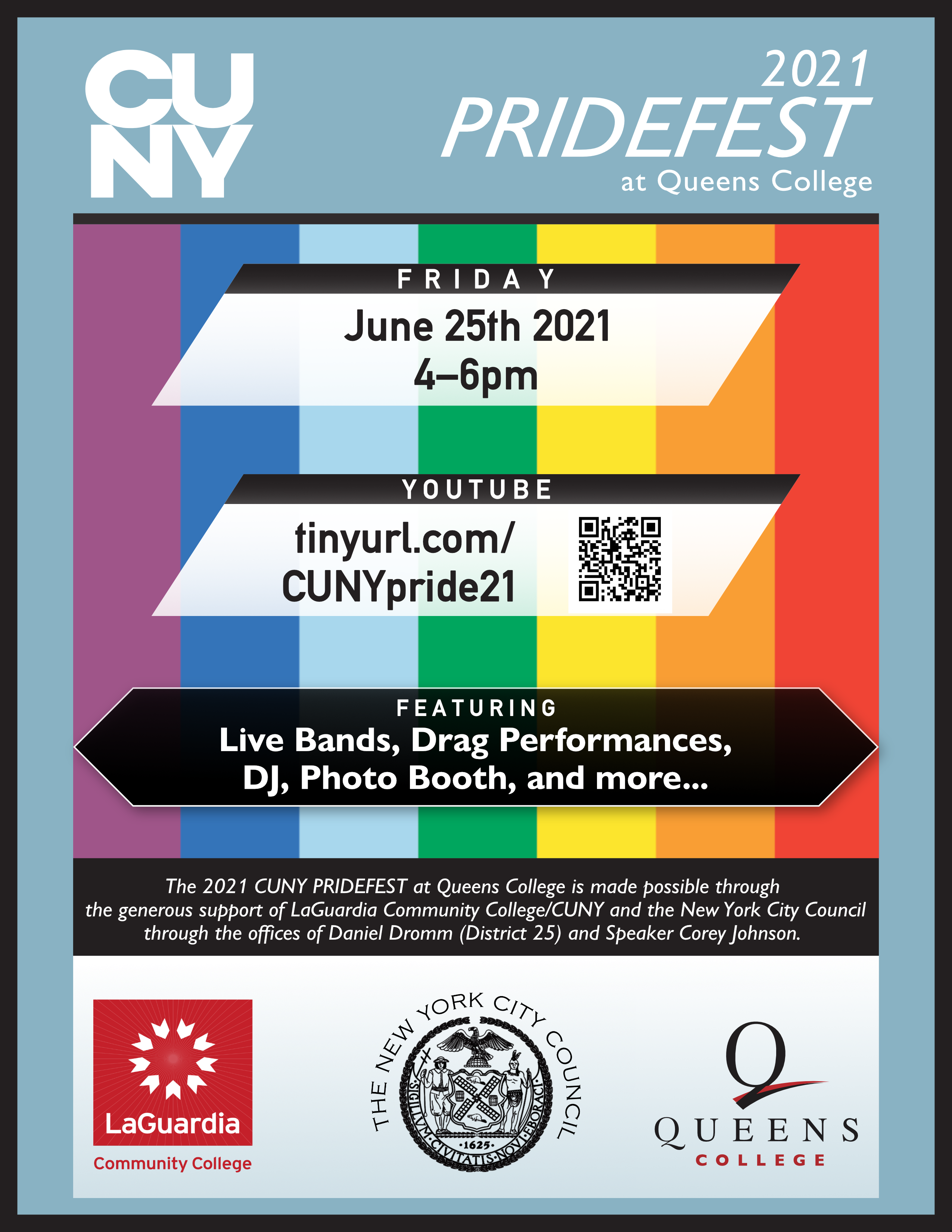 Greetings Student Affairs, Please join us for CUNY Pridefest and share with your students, colleagues, families and friends! 4th Annual CUNY Pridefest at Queens College Friday, 6/25 4pm - 6pm EVENT DESCRIPTION: Faculty, staff and students from CUNY's (11) senior colleges, (7) community colleges and (7) honors and professional schools will celebrate their virtual pride this year with a celebration that includes exciting drag performances to entertain us, talented musical acts to keep the energy alive and more. Our DJ will be pumping, PRIDE dancers will be featured, and the festival-goers can capture their favorite moments with our virtual photo booth. This event will be livestreamed on YouTube. This event is open to the public, and registration is required: https://tinyurl.com/CUNYpride21 This event is made possible through the generous support of the New York City Council through the offices of Daniel Dromm (District 25) and Speaker Corey Johnson, and LaGuardia Community College/CUNY. Co-sponsors: The Office of the President at Queens College, the Queens College Office of Student Development and Leadership, the CUNY Office of Student Inclusion Initiatives, the Women and Gender Studies Department at Queens College, the Queens College Student Association, the Arts Club at Queens College, the Queens College Gender, Love and Sexuality Alliance/GLASA, and the LaGuardia and Wagner Archives at LaGuardia Community College. The video footage from this event will be preserved in the LaGuardia and Wagner Archives/CUNY. Event flyer attached. Seeya there! -JC