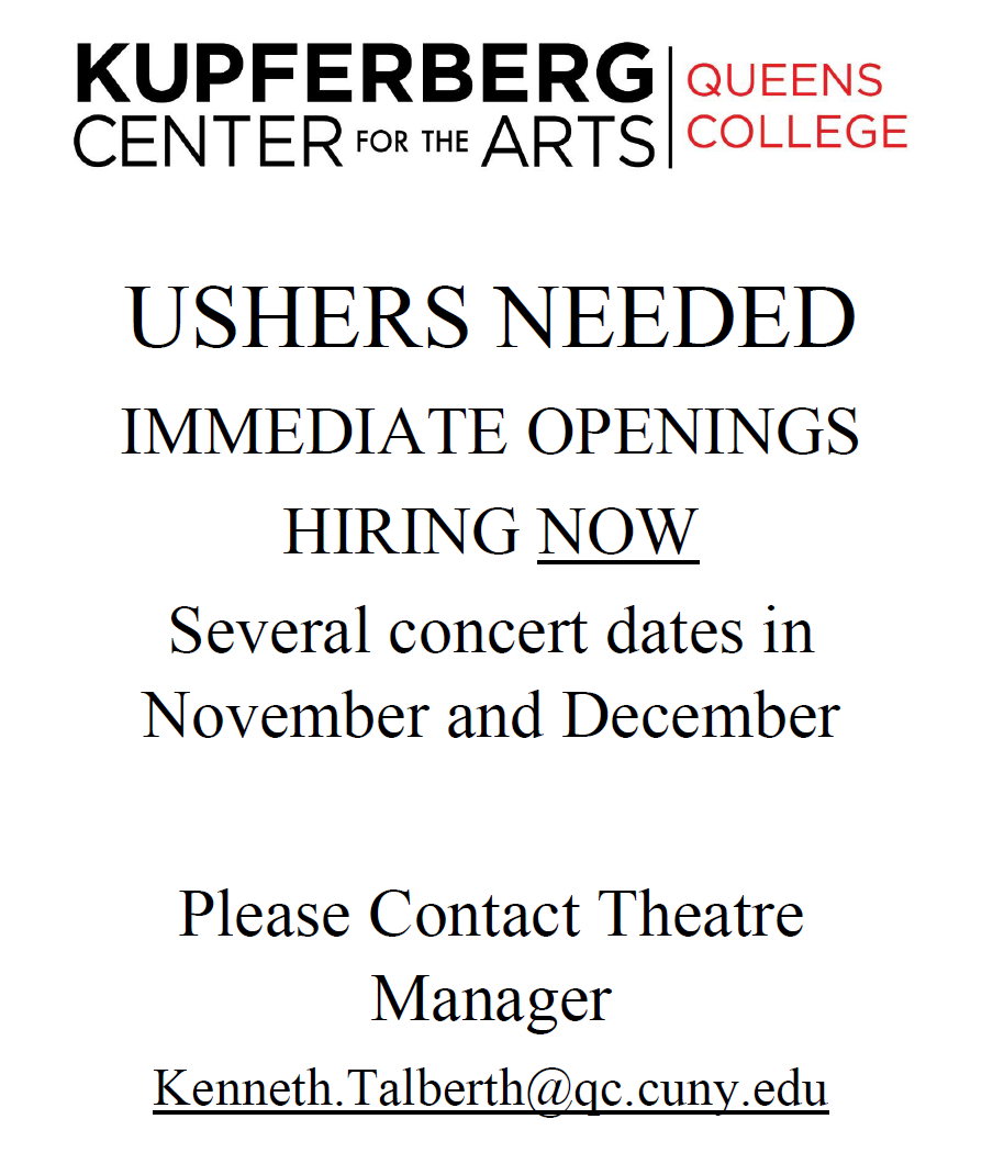 Happy Friday Student Affairs Enrollment Management team, CREAR Futuros mentees, Please feel free to pass the flyer and email along to students, the Kupferberg Center for the Arts is need of several ushers for concerts that are happening 11/20, 12/3 & 12/19. The pay is $15.00 and hour. Experience is not necessary but ability to work with the public is. If you are interested, please feel free to contact Theater Manager, Kenneth Talberth at Kenneth.Talberth@qc.cuny.edu<mailto:Kenneth.Talberth@qc.cuny.edu>. [A picture containing text Description automatically generated] Best, Irving R. Uribe, M.F.A. 08', B.F.A. 06' (He, Him, His) Executive Assistant for the Vice President for Student Affairs CREAR Futuros<https://www.crearfuturos.org/> Campus Liaison Queens College<https://www.qc.cuny.edu/Pages/home.aspx>, CUNY | 65-30 Kissena Boulevard, Queens, NY 11367-1597 718-997-5501 | irving.uribe@qc.cuny.edu<mailto:irving.uribe@qc.cuny.edu> | LinkedIn<http://www.linkedin.com/in/irvingruribe>