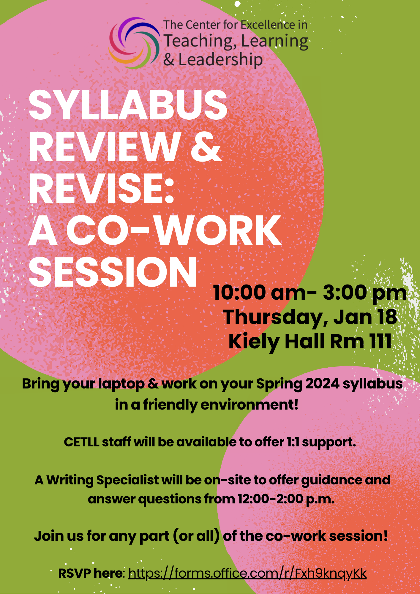 join us! Syllabus Review and Revise: a co-work session at CETLL 1/18 from 10a-3p